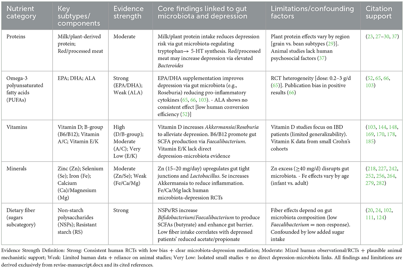 At present, depression has become a major mental illness worldwide (1), especially since the COVID-19 pandemic, when the incidence of depression has accelerated by 25% globally (2, 3). This review focuses on “major depressive disorder (MDD)”—the most common subtype characterized by persistent low mood, loss of interest, and impairment in social/occupational function—rather than bipolar depression or situational depression, as MDD has the strongest evidence linking to dietary and gut microbiota changes (1, 4). According to the Global Burden of Disease Study 2023 [consistent with (2) but more precise], MDD affects approximately 280 million people globally, accounting for 3.6% of the total population; in low- and middle-income countries, the 12-month prevalence of MDD reaches 5.9% (range: 3.8%−10.4%) (5), and post-COVID-19, the incidence in adolescents and young adults (18–25 years) increased by 40% compared with pre-pandemic levels (2). However, existing medical methods (e.g., antidepressants) have a response rate of only 50% in MDD patients (6), and early clinical symptoms of depression (e.g., anhedonia, sleep disturbance) are often ignored, further worsening health outcomes. However, existing medical methods cannot be used to diagnose and prevent depression early, and early clinical symptoms of depression affect the health and function of the human body. Therefore, new approaches are needed for early intervention and prevention of depression. Recent studies have shown that nutritional deficiencies are closely related to mental health (7–9), and adhering to healthy dietary patterns (e.g., Mediterranean diet) can reduce depression risk—yet these patterns exert effects primarily through their core nutrients (e.g., omega-3 from fish, fiber from vegetables) (10). We focus on nutrient deficiency rather than “diet as a whole” for three reasons: 1. functional specificity: diet is a complex mixture of components, while nutrients (e.g., protein, vitamin D) are the functional units that directly interact with gut microbiota and regulate physiological processes linked to depression (e.g., neurotransmitter synthesis, inflammation) (11, 12); 2. causal relevance: nutrient deficiency (e.g., tryptophan shortage) is a modifiable risk factor for early depression, whereas “unhealthy diet” is a broad concept that includes non-nutritional factors (e.g., food processing) (7, 9); 3. mechanistic clarity: the link between nutrient deficiency, gut microbiota dysbiosis (e.g., reduced Bifidobacterium), and depressive symptoms is more directly measurable (e.g., via SCFA levels, neurotransmitter concentrations) than the vague association between “overall diet” and mood (11, 13). However, owing to the complex relationship between mood and eating habits, people choose some favorite junk food when they are depressed, such as high-fat and high-sugar food (french fries, soda, and fried food); while so-called “comfort food” (e.g., hot pot) and stimulating food (e.g., spicy snacks, processed meats)—the latter share similar high-fat/high-salt traits to the aforementioned unhealthy foods; although these foods can temporarily regulate mood, long-term consumption affects health. Therefore, it is difficult to explain the mechanism by which nutrition regulates mood. This complexity stems from three key aspects: 1. bidirectional interaction between mood and diet: depressive mood may reduce intake of nutrient-dense foods (e.g., vegetables, fish) and increase craving for junk food, forming a “malnutrition-depression” cycle that confounds causal inference (14, 15); 2. interindividual variability: gut microbiota composition (e.g., Bifidobacterium abundance) and nutrient metabolism capacity (e.g., omega-3 conversion efficiency) differ by age, ethnicity, and lifestyle, leading to heterogeneous responses to nutritional intervention (16, 17); 3. multilevel mediation of the gut-brain axis: Nutrients act on mood not directly, but via gut microbiota-derived metabolites (e.g., SCFAs), neurotransmitter synthesis (e.g., tryptophan → 5-HT), and immune inflammation regulation—these cascading pathways are difficult to disentangle in human studies (13, 18).