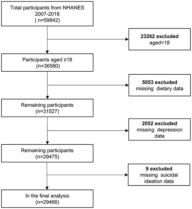 The NHANES is an ongoing health and nutrition survey conducted by the National Center for Health Statistics (NCHS). Its methodology combines interviews, physical examinations, and laboratory tests. The interviews typically encompass queries about health status, health behaviors, and dietary habits. Physical examinations and laboratory tests are conducted in a specialized mobile examination center (MEC). Participants must fast for at least 9 h. All anthropometric indexes were measured at the MEC by standardized protocols (19). Laboratory tests included the collection of blood and urine samples. Data are collected annually and released periodically, representing the general U.S. population. This aids government and research institutions in monitoring changes in public health and nutrition. The NHANES data are accessible to researchers and the public. The survey protocol has been approved by the NCHS Research Ethics Review Board (ERB). Informed consent was provided by all participants. Our analysis included 29,466 participants after exclusions based on the following criteria: (1) age under 18 years old; (2) missing data on riboflavin intake; (3) missing data on depression; (4) missing data on suicidal ideation (Figure 1).