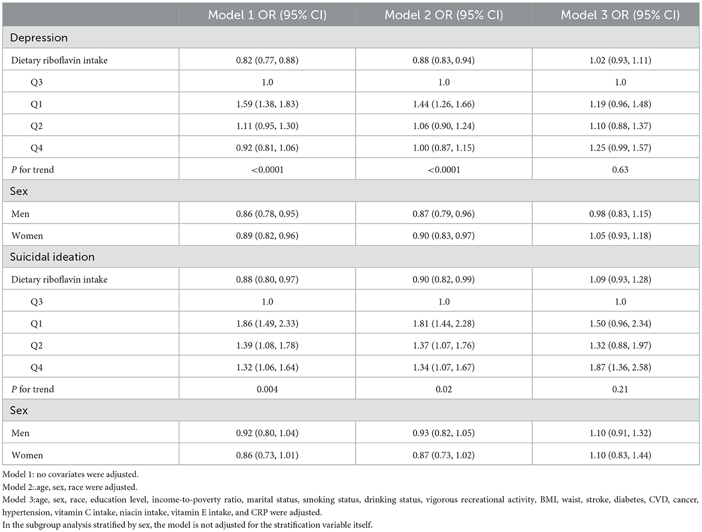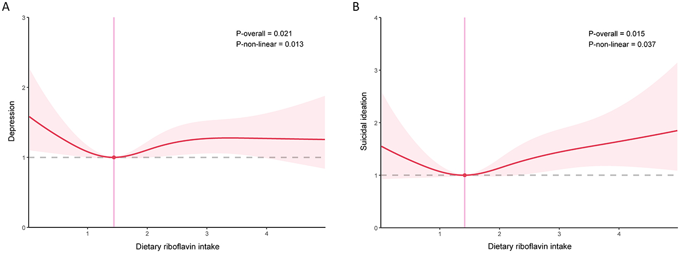 Conclusions: In this large-sample study, the non-linear association of dietary riboflavin intake with depression and suicidal ideation was found. Furthermore, differences in this relationship based on sex were observed.