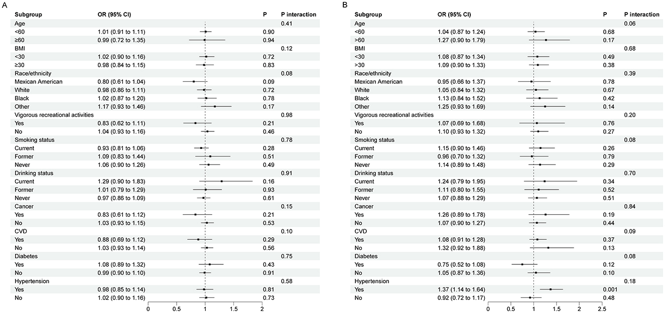 Figure 5. Subgroup analysis of association between dietary riboflavin intake with depression and suicidal ideation (A) depression; (B) suicidal ideation.