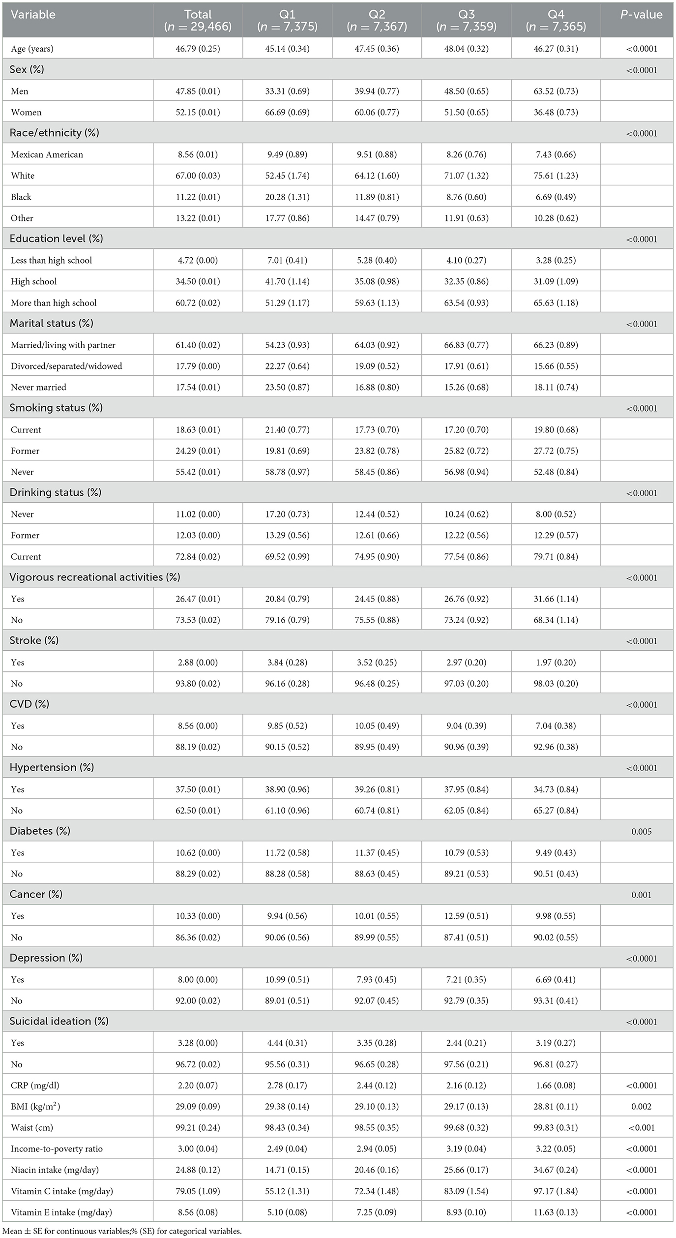 Given the sampling survey methodology employed by NHANES, we conducted weighted analyses on the data to ensure the results were representative of the American population. For baseline characteristic analysis, the study population was divided into four groups based on quartiles of riboflavin intake. Statistical differences between groups were assessed using one-way analysis of variance (ANOVA) for continuous variables and chi-square test for categorical variables. For continuous variables, data was presented as means ± standard error (SE), and for categorical variables, as percentages (SE).