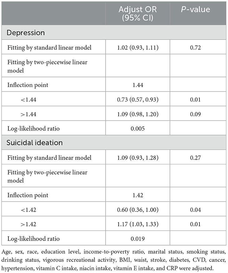 Table 3. Threshold effect analysis of dietary riboflavin intake on depression and suicidal ideation using a two-piecewise linear regression model.