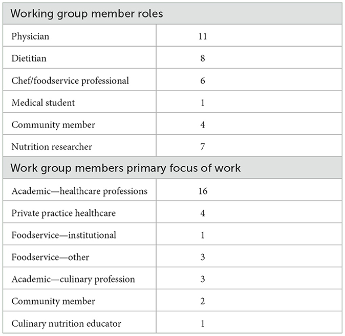 Working group member roles also crossed over in their focus of work and professional or community settings, such as working in academia, private practice, institutional foodservice settings (e.g., schools, hospitals), other foodservice (e.g., restaurants, academia), or community-facing roles like extension service or other non-healthcare professionals (Table 1). As an example of crossover, the working group included members trained as chefs and health care professionals with experience teaching in community and academic settings.