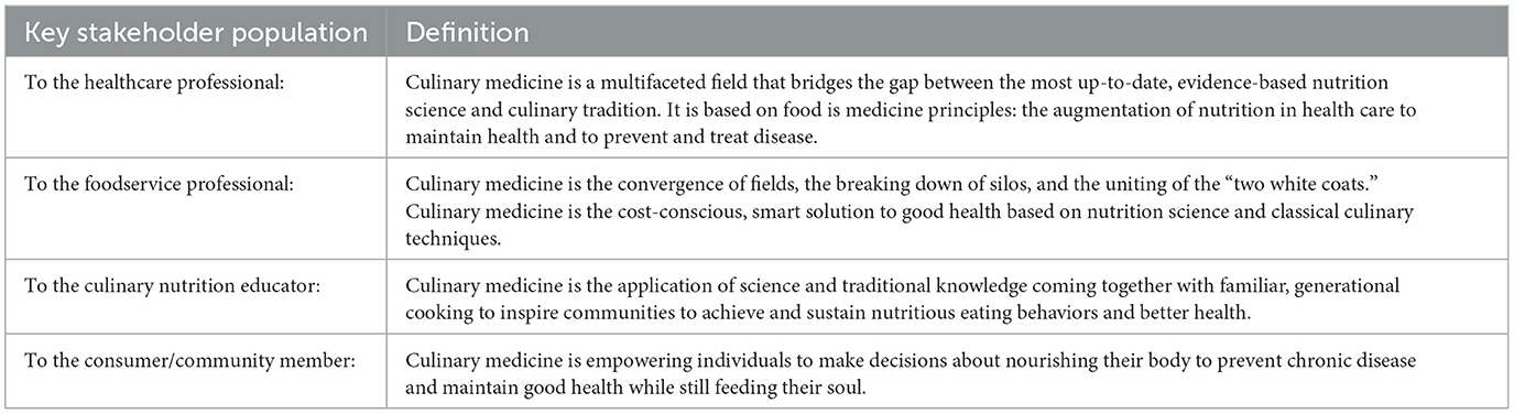 While initially aiming for a single definition of culinary medicine, the working group determined through the process that multiple definitions, tailored to the various stakeholders in culinary medicine, were needed to capture the variety of perspectives in this multidisciplinary field. The working group reached consensus to define the dynamic term of culinary medicine through the lenses of four key stakeholder groups identified: healthcare professionals, foodservice professionals, culinary nutrition educators, and community members. Consensus definitions of culinary medicine by stakeholder group are listed in Table 2.