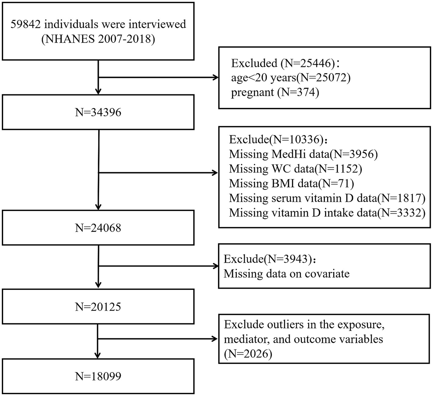 We restricted our study sample to adults aged ≥20 years to ensure comparability with previous research on obesity and vitamin D status in adult populations. Pregnant participants were excluded due to altered vitamin D metabolism and body composition during pregnancy, which could confound the analysis. Specifically, individuals with outlier values in BMI and WC were identified through distributional diagnostics and excluded from the final analysis. Participants with missing data on key exposure, mediator, or outcome variables were excluded to maintain the integrity of the mediation analysis. Participants with extreme outlier values in the exposure (MedHi), mediator (serum vitamin D), and outcome variables (BMI and WC) were excluded based on visual inspection of their distributions and standardized thresholds. Our final analytical sample comprised 18,099 participants. The inclusion and exclusion criteria are summarized in Figure 2.