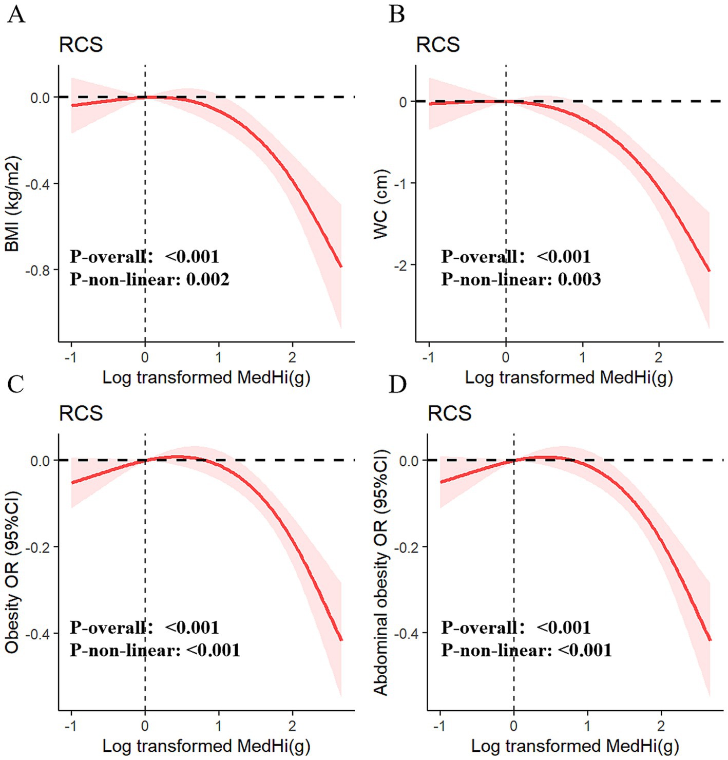 Figure 3. Dose–response relationships of MedHi intake with BMI (A), WC (B), obesity (C), and abdominal obesity (D).
