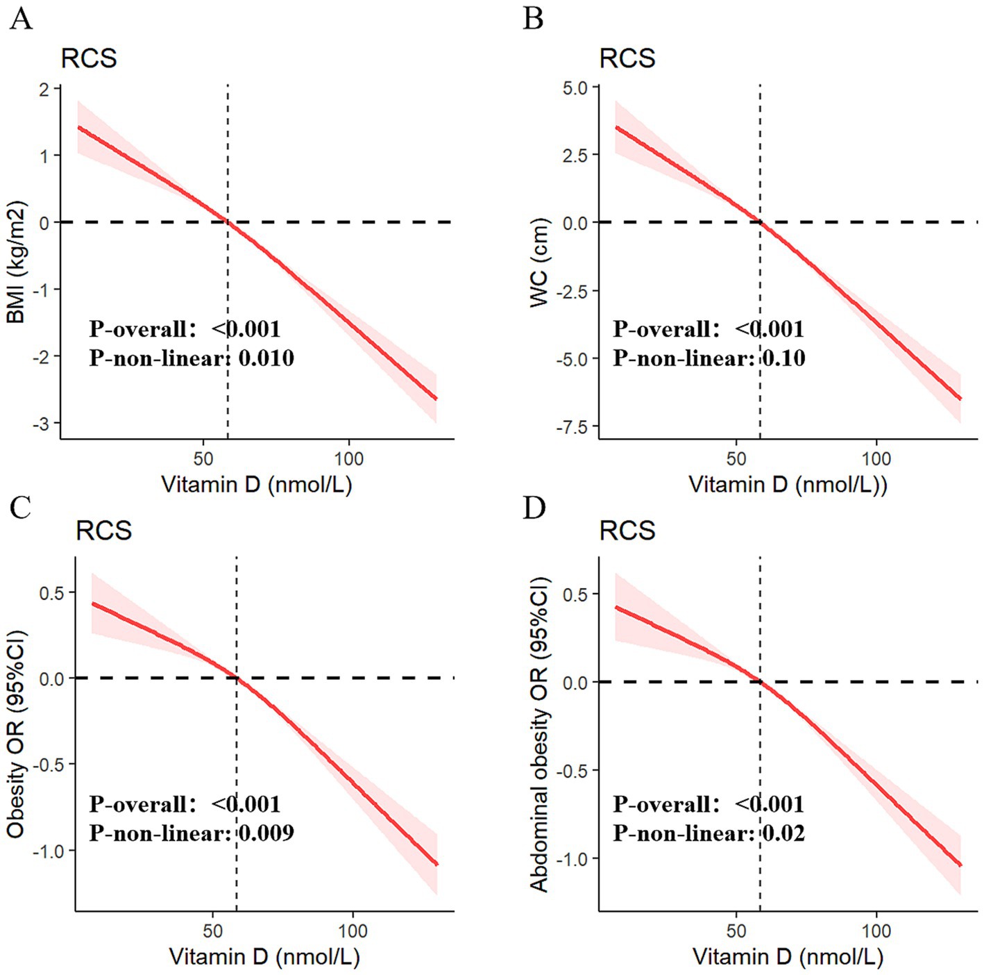 Figure 4. Dose–response relationships of serum vitamin D with BMI (A), WC (B), obesity (C), and abdominal obesity (D).