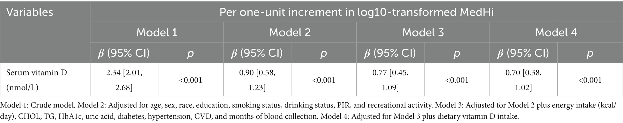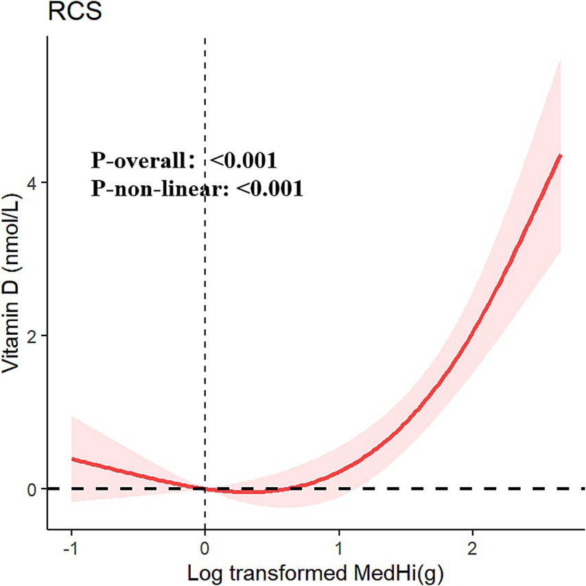 The multivariable generalized linear regression coefficients for serum vitamin D levels, corresponding to a one-unit increment in the log10-transformed MedHi, are detailed in Table 4. The results consistently show a positive association across all four models. Specifically, each one-unit increment in the log10-transformed MedHi consumption was associated with increases in serum vitamin D levels of 2.34 nmol/L (95% CI: 2.01, 2.68), 0.90 nmol/L (95% CI: 0.58, 1.23), 0.77 nmol/L (95% CI: 0.45, 1.09), and 0.70 nmol/L (95% CI: 0.38, 1.02), respectively. Further analysis using adjusted RCS models indicated that the relationship between MedHi consumption and serum vitamin D levels is nonlinear, with a significant test for nonlinearity as shown in Figure 5.