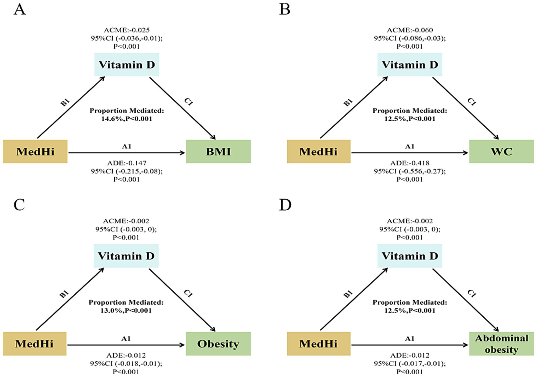 Mediation analyses were conducted to assess the potential mediation effects of serum vitamin D on the relationships between dietary intake of live microbes and various obesity-related metrics. The analysis revealed significant mediation effects of serum vitamin D on the associations with BMI, WC, obesity, and abdominal obesity. The proportions of mediation were 14.6, 12.5, 13.0, and 12.5% respectively, all achieving statistical significance (p < 0.001), as shown in Figures 6A–D. To evaluate the role of vitamin D in the interaction between MedHi intake and obesity metrics, mediation models were thoroughly adjusted for a comprehensive set of variables. These included age, sex, race, education, smoking status, drinking status, PIR and recreational activity, energy intake (kcal/day), CHOL, TG, HbA1c, uric acid, diabetes, hypertension, CVD, and months of blood collection and dietary vitamin D intake.