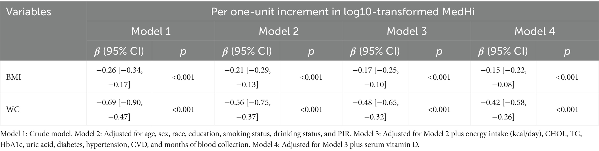 Table 1. Regression analysis showing the association between log10-transformed MedHi (g) and BMI, WC.