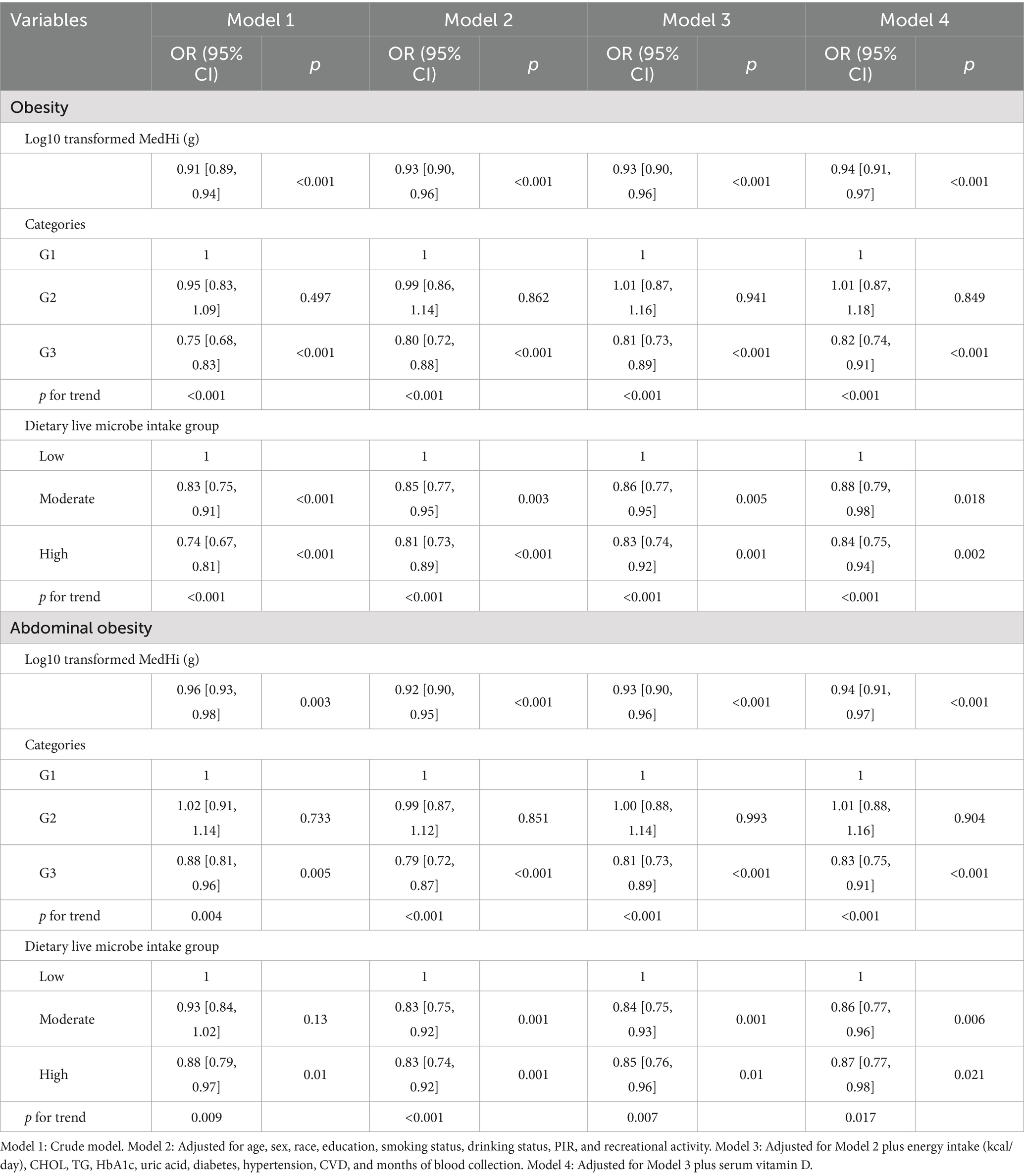 Additionally, when MedHi consumption was categorized, the risk of both obesity and abdominal obesity was significantly lower in the G3 group (highest consumption category) compared to the G1 group (non-consumers) across all four models. The analysis revealed that the risks of both obesity and abdominal obesity were significantly lower in the moderate and high intake groups compared with the low intake group.
