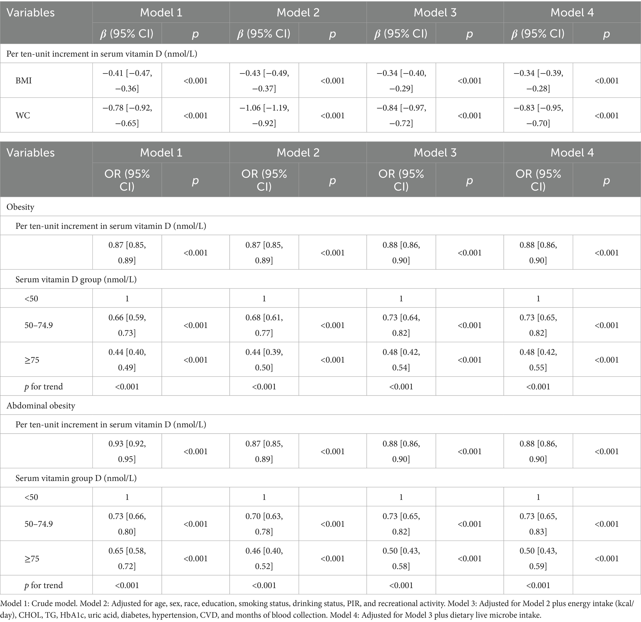 Additionally, univariate and multivariable weighted logistic regression analyses showed that higher serum vitamin D levels were significantly associated with lower odds of both general obesity and abdominal obesity. The RCS curves (Figures 4C,D) confirmed robust negative dose–response relationships between vitamin D levels and both outcomes. When serum vitamin D was categorized into deficiency, insufficiency, and sufficiency groups, participants in the higher-level categories consistently showed lower risks of obesity and abdominal obesity across all four models. Full model specifications and estimates are provided in Table 3.