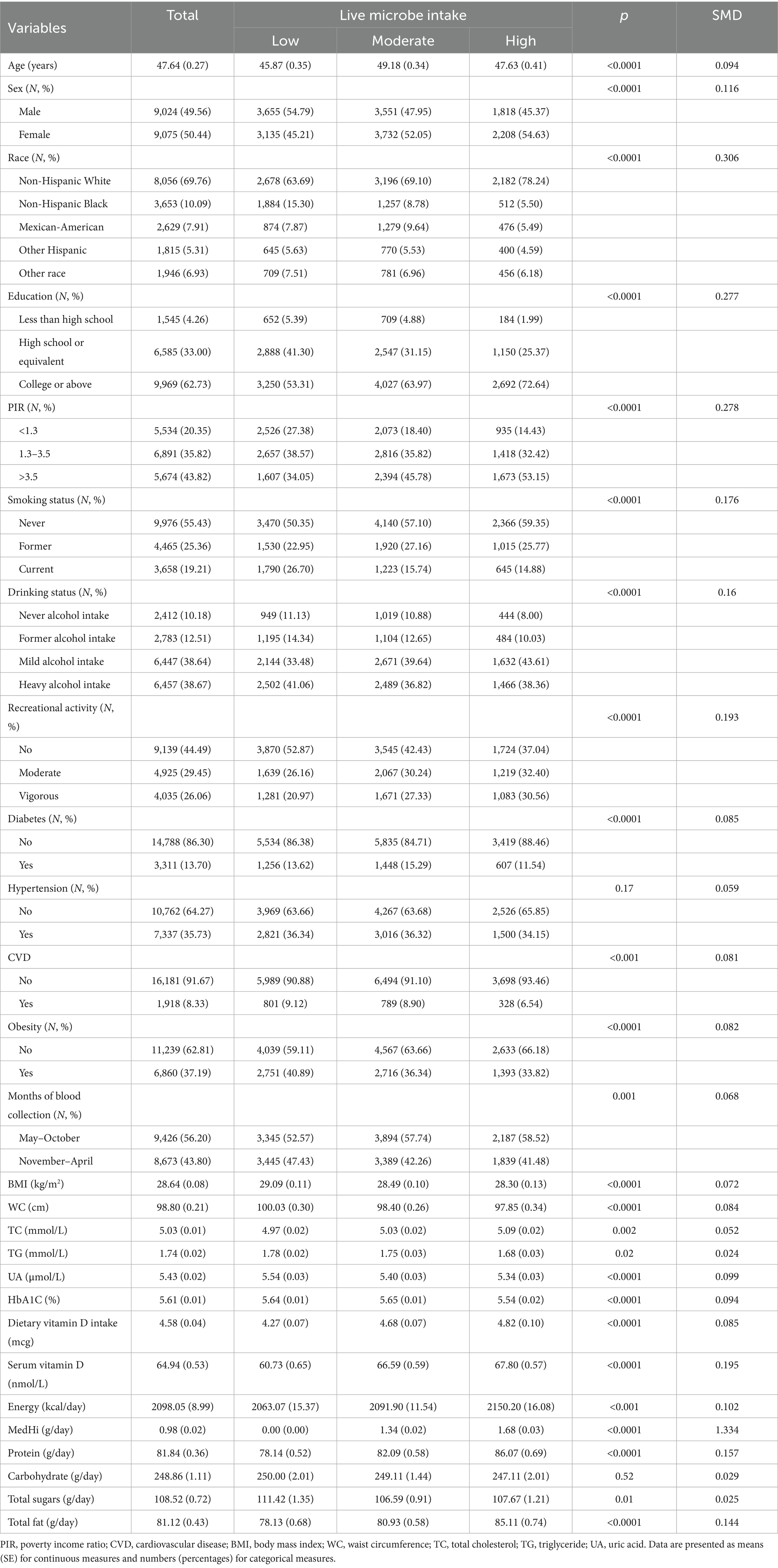 The demographic characteristics of 18,099 participants from the NHANES, surveyed between 2007 and 2018, are detailed in Table 5. The average age was 47.64 ± 0.27 years, with males comprising 54.79% of the cohort. A majority, 95.74%, had received education at a high school level or higher. The racial composition was predominantly White (69.76%) and Black (10.09%), with 79.85% identifying as non-Hispanic. Mexican Americans represented 7.91%, other Hispanics 5.31%, and other racial groups 6.93%. Additionally, 44.57% of participants had a history of tobacco use and 77.31% reported alcohol consumption. Prevalence rates for DM and CVD were 13.70 and 8.33%, respectively, while hypertension was reported by 35.73%. The average BMI was 28.64 ± 0.08 kg/m2, with no significant difference between men (28.63 ± 0.09) and women (28.65 ± 0.11; p = 0.85). In contrast, the mean waist circumference (WC) differed significantly by sex, measuring 101.51 ± 0.25 cm in men and 96.13 ± 0.26 cm in women (p < 0.001). Detailed sex-specific anthropometric data are presented in Supplementary Table S6. Across live microbe intake groups, race (SMD = 0.306), education (0.277), and income-to-poverty ratio (0.278) showed notable differences. High intake was more common among non-Hispanic White, and among those with higher education and income. Smaller imbalances were seen in sex, physical activity, and serum vitamin D levels. Overall, most SMDs were <0.2, indicating minimal baseline differences between groups.
