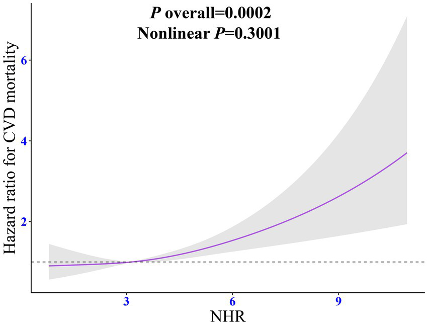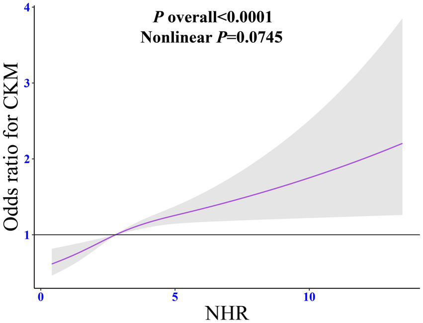 When describing the characteristics of the participants, for the comparison between continuous variables, the Wilcoxon rank-sum test was used, and the corresponding results were presented in the form of mean values and standard errors (SEs). For categorical variables, the chi-square test was applied, and they were expressed using the number of cases (n) and the percentage (%). Considering compliance with statistical norms and facilitating subsequent interpretation, before being incorporated into the multivariate logistic regression model or the multivariate COX proportional hazards model, NHR was standardized and transformed into a Z-score. Subsequently, the associations between exposure factors and outcomes were evaluated, specifically estimating the odds ratios (ORs), hazard ratios (HRs), and 95% confidence intervals (CIs). Several models were constructed during the research process. Model 0 made no adjustments to the covariates, aiming to provide a basic reference. Model 1 included and adjusted for covariates such as gender, age, race, educational attainment, marital status, and family economic status, initially controlling some interfering factors at the level of individual basic characteristics. Model 2 went further by including factors such as alcohol consumption, smoking, exercise level, dietary energy intake, and BMI in the adjustment scope. Model 3, based on the above, continued to adjust for factors related to comorbidities, medication history, and serum TC level, covering hypertension, diabetes, thyroid diseases, liver diseases, arthritis, tumors, history of statin use, and serum TC level, striving to exclude the influence of various potential confounding factors as much as possible. To ensure the reliability of the models, the variance inflation factor (VIF) was used to check for collinearity issues. In this study, all VIF values were less than 10, effectively avoiding the misguidance of collinearity on the results. Meanwhile, Schoenfeld residuals were used to test the proportional hazards assumption. The test showed that this study fully conformed to this premise assumption, ensuring the applicability of the COX proportional hazards model. In addition, subgroup analysis was carried out, and the likelihood ratio test was used to explore the interaction between covariates and NHR, aiming to uncover potential variable association patterns. Finally, restricted cubic splines (RCS) were employed to evaluate the dose-response relationship between the continuously changing NHR and the risks of CKM syndrome and CVD mortality, delicately depicting the dynamic associations between variables.