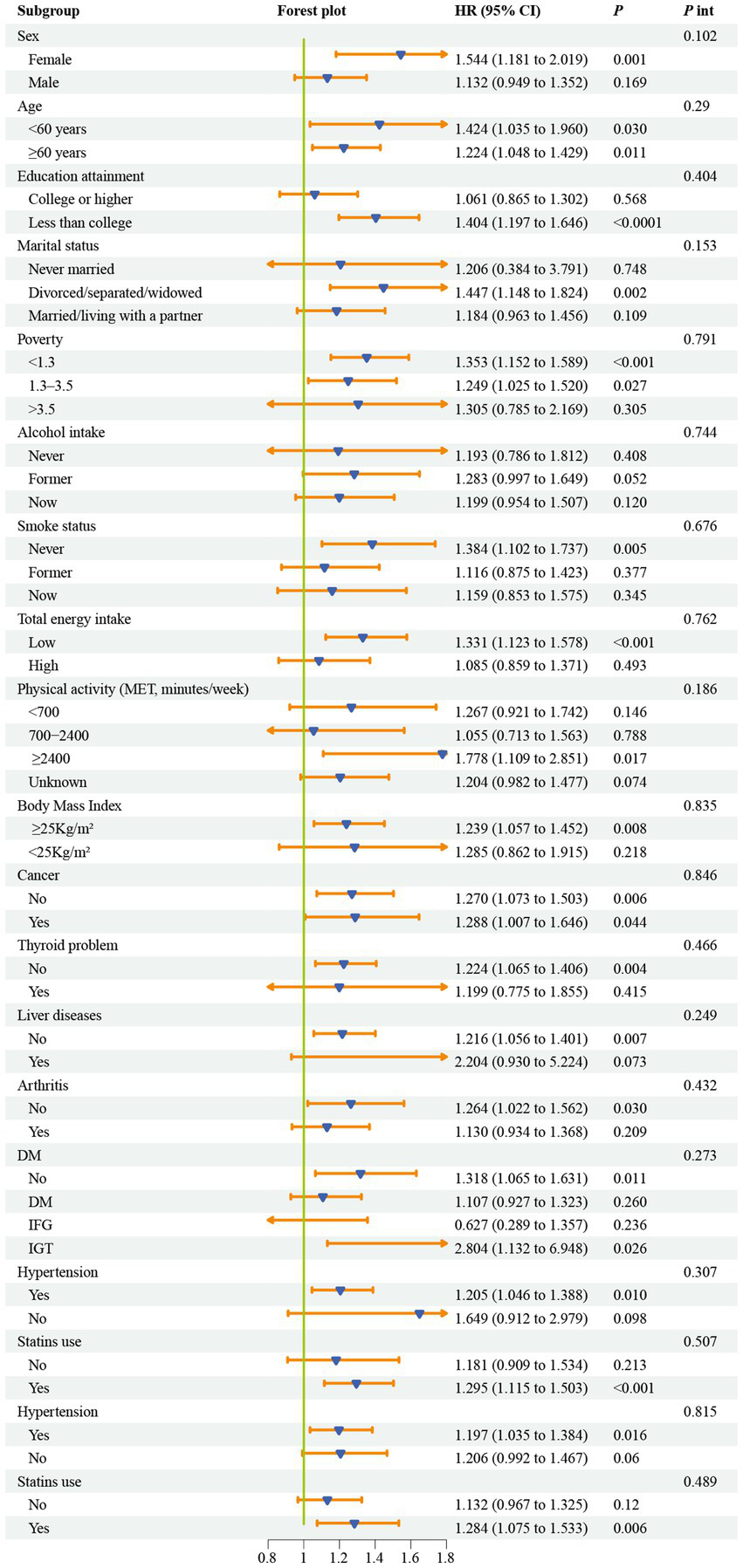When conducting this study, we extensively reviewed a large number of relevant previous works of literature and determined the following confounding factors in close combination with the unique characteristics of the NHANES database (20, 21). On the one hand, in the variable collection stage, we focused on the demographic and socioeconomic categories. The specific variables covered include a categorical variable for individual gender; a continuous variable for individual age that accurately reflects the age changes; a racial variable subdivided into five categories according to different ethnic characteristics; an educational background variable divided into two categories, namely a college degree or above and other levels, based on the differences in educational attainment; a marital status variable classified into three categories according to the actual marital situation; and a poverty-income ratio (PIR) variable, also divided into three categories, constructed according to the relationship between poverty and income. On the other hand, we comprehensively collected variables related to lifestyle and physical indicators. For example, a smoking status variable subdivided into three categories according to the different degrees and frequencies of smoking behavior; a three-category variable divided according to drinking habits; a physical activity variable classified into three categories, namely less than 700 min of weekly physical activity, between 700 and 2,400 min, and more than 2,400 min, based on the length of weekly physical activity time; a continuous variable: total dietary energy intake, which can intuitively show the overall level of an individual’s dietary energy intake; and a body mass index (BMI), also a continuous variable, used to measure the proportional relationship between an individual’s body mass and height. Moreover, during the research process, we also fully considered various characteristic factors closely related to health. These include a binary variable to determine whether an individual has cancer; a binary variable to judge whether there are thyroid problems; a binary variable to identify whether an individual has arthritis; a binary variable to examine whether there are liver diseases; a diabetes status variable divided into three categories, namely no, yes, and prediabetes, to define the state of diabetes; a binary variable to confirm whether an individual has hypertension; a binary variable to consider whether statin drugs are used; and a concentration variable reflecting the level of total cholesterol (TC) in the serum.