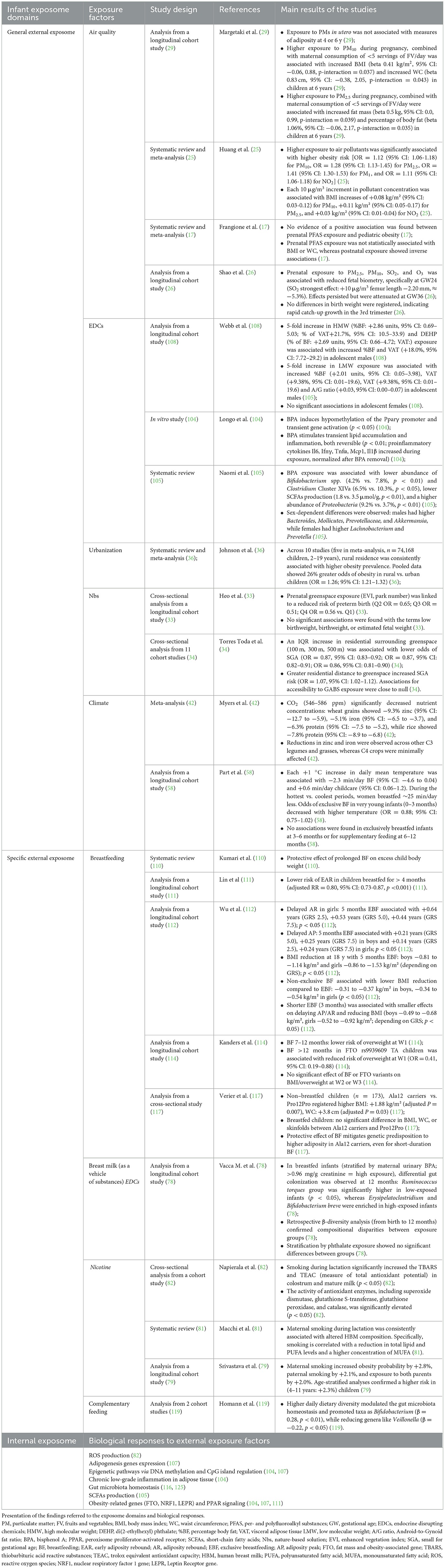 During the “first 1,000 days” feeding practices, maternal substance consumption, and infant lifestyle factors are key components of the specific external exposome and may affect the risk of childhood obesity (61–63).