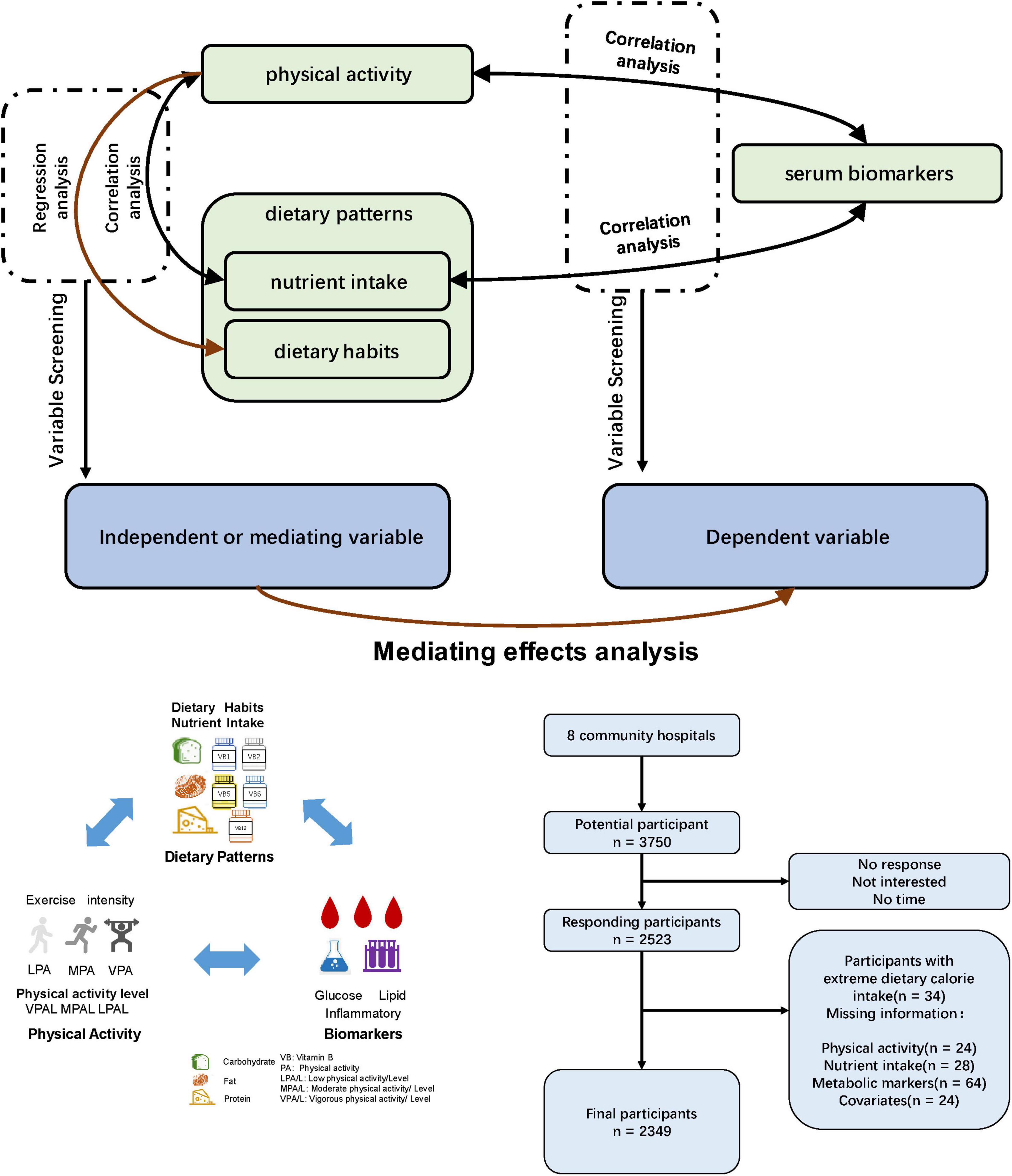 Results: There was a close association between physical activity and diet. Moderate - intensity physical activity (MPA) was positively associated with the intake of dark green leafy vegetables (β = 0.174) and negatively associated with the intake of unprocessed red meat (β = −0.112) and deep - fried foods (β = −0.117). Both physical activity and diet affected biomarkers. Vigorous physical activity was positively correlated with high - density lipoprotein cholesterol (r = 0.144), while MPA was negatively correlated with blood glucose (r = −0.127) and CRP (r = −0.129). The percentage of protein intake was positively correlated with triglycerides (r = 0.118). Mediation analysis demonstrated the combined effects of physical activity and diet. The results showed that MPA significantly and negatively affected CRP levels, with the intake of dark green leafy vegetables mediating this relationship (P < 0.05). MPA also significantly and negatively affected blood glucose levels, with vitamin B12 intake mediating this relationship (P < 0.05).