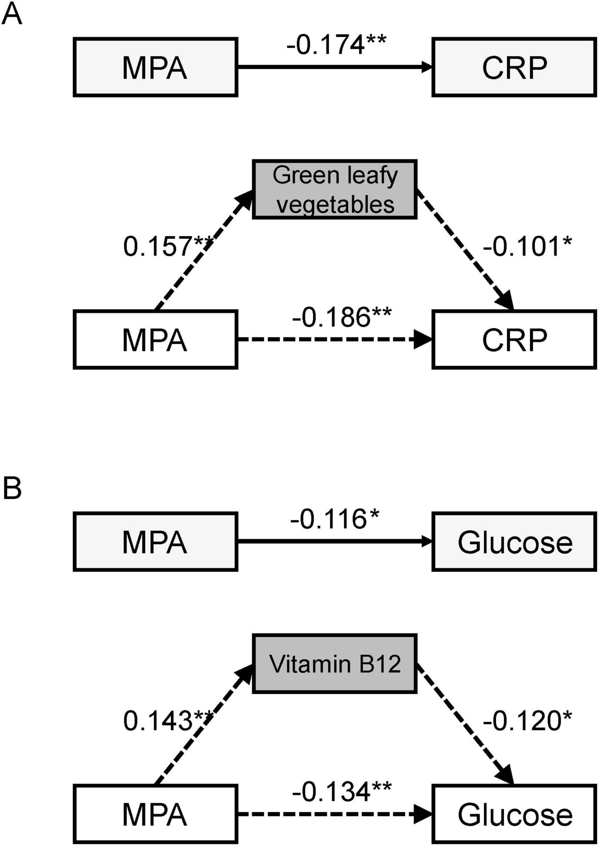 Figure 2. The mediation model of diet mediating the effects of physical activity on biomarkers. (A) Significant mediating effects between MPA, dietary habits and CRP. (B) Significant mediating effects between MPA, nutrient intake and glucose. MPA, moderate - intensity physical activity; CRP, C - reactive protein. *P < 0.05, **P < 0.01.