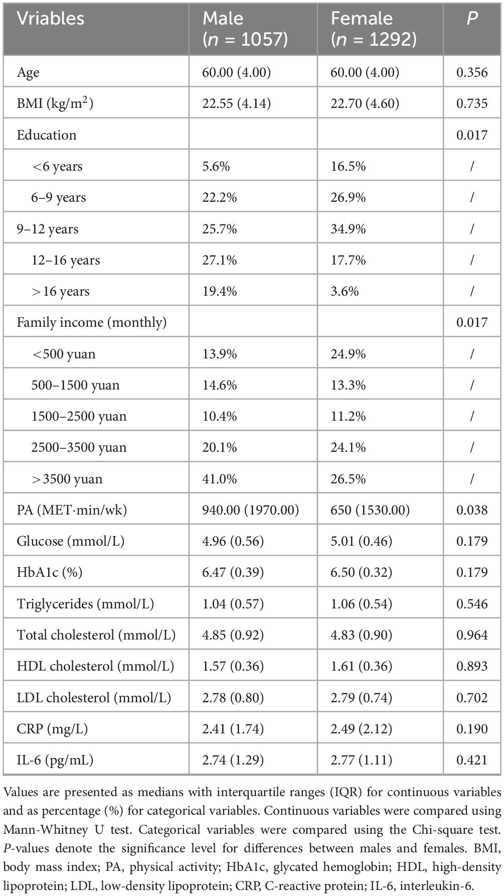 Table 1 presents the sociodemographic characteristics stratified by gender. Comparative analyses revealed statistically significant differences between males and females in terms of education and income (P = 0.017). Males demonstrated significantly higher levels of total physical activity compared to females (P = 0.038). Differences in other indices were not statistically significant.