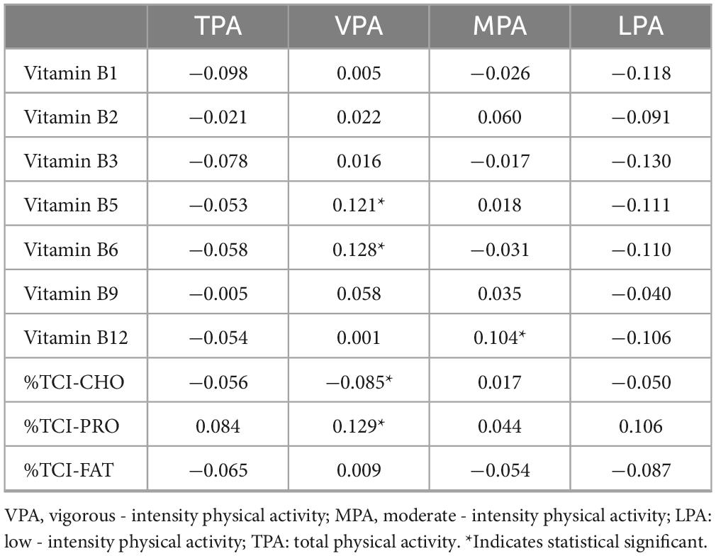 The results revealed significant positive correlations between high-intensity physical activity and the intake of protein, vitamins B5, B6, and B12. Previous research has demonstrated that high-intensity exercise stimulates greater protein consumption and increases requirements for B vitamins involved in protein metabolism and energy production (40). Studies indicate these nutrients play vital roles in muscle recovery and metabolic processes following intense physical activity (41).