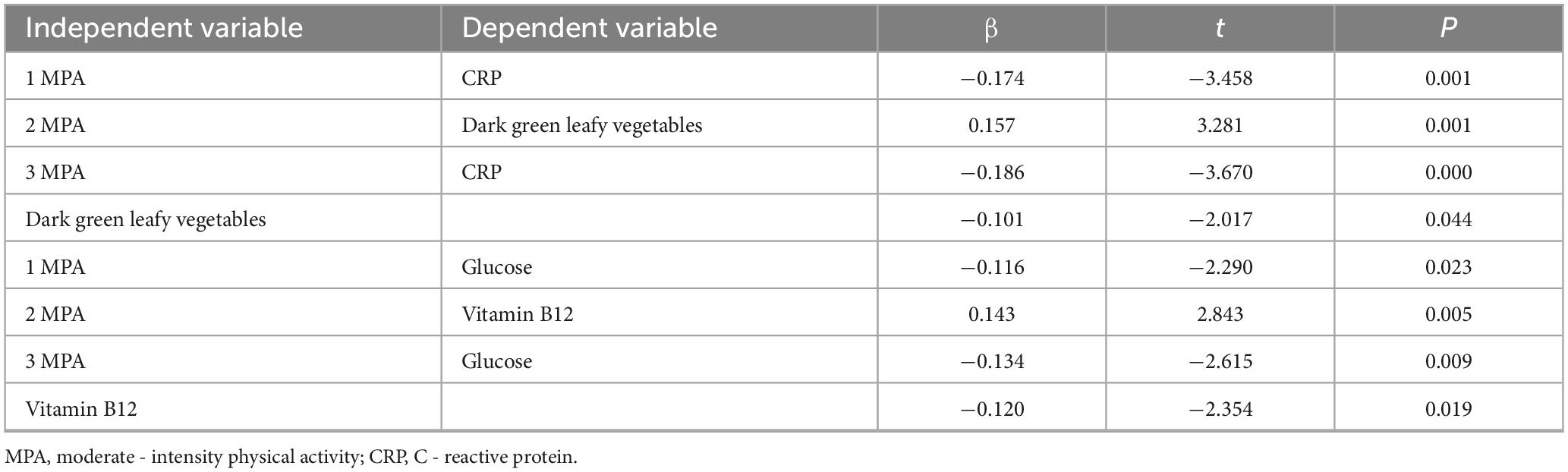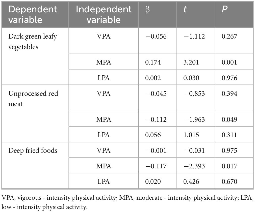 Table 3 results, derived from multivariate linear regression controlling for confounding factors, indicate a positive association between moderate-intensity physical activity and the intake of dark green leafy vegetables (β = 3.201). Conversely, moderate-intensity physical activity was negatively associated with the intake of unprocessed red meat (β = −1.963) and deep-fried foods (β = −2.393).