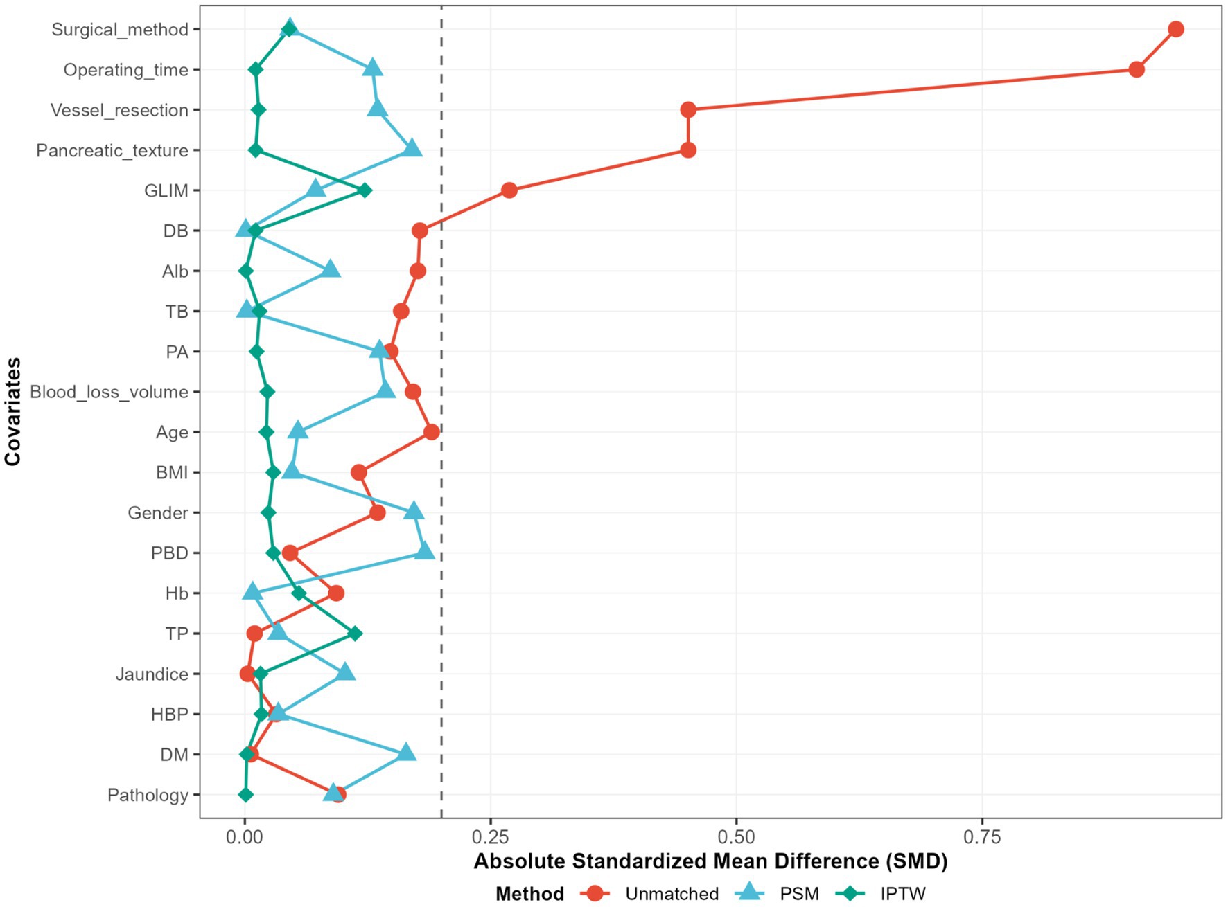 Figure 1. Standardized mean differences (SMD) of patients, patients after propensity score matching; PSM, propensity score matching; IPTW, inverse probability of treatement weighting; unmatched, raw data.