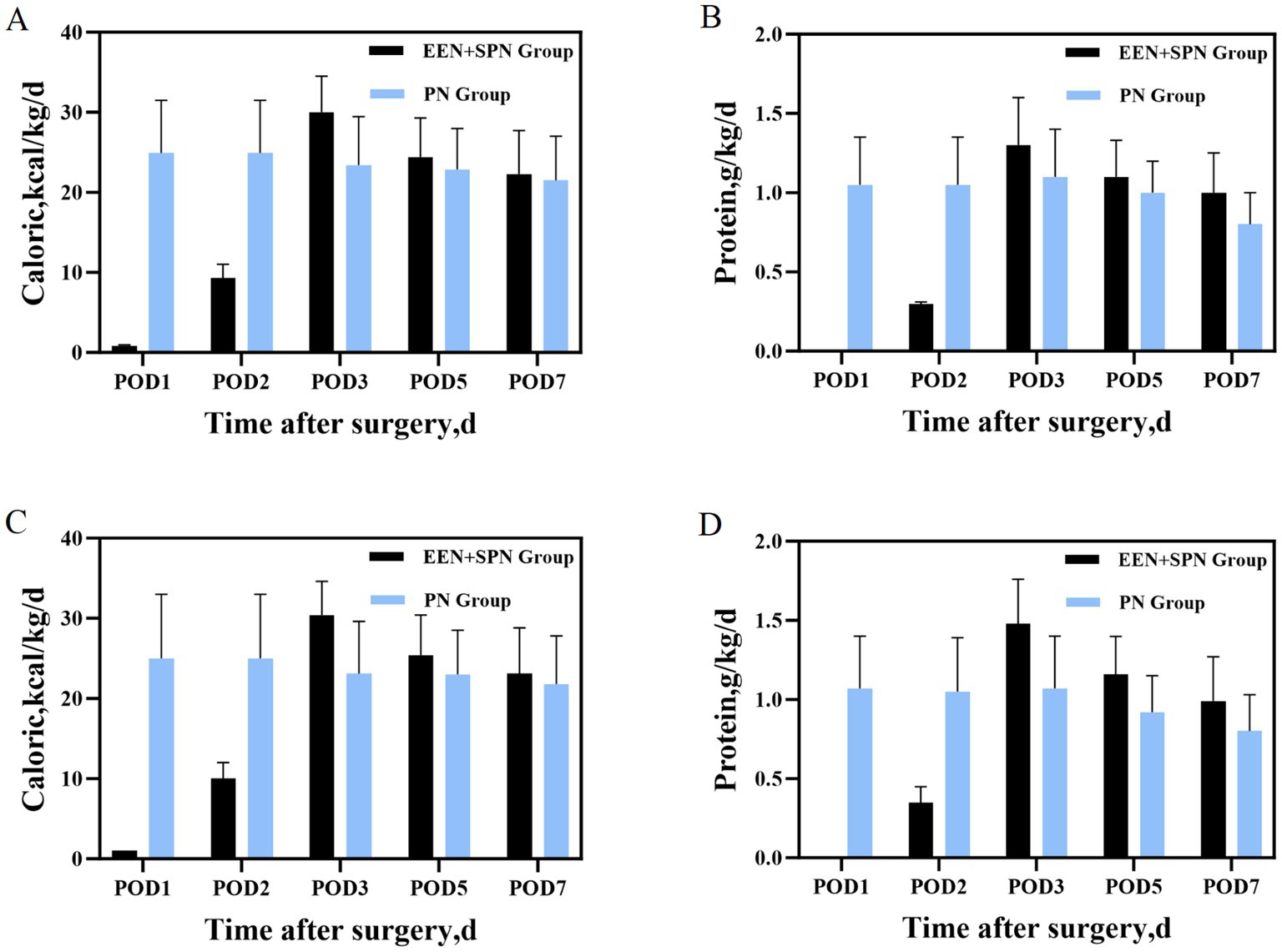 In patients in the EEN + SPN group, a gastric tube was routinely placed intraoperatively. During surgery, nasojejunal nutrition tubes were placed in the jejunum to facilitate postoperative EN delivery. EN was initiated within 24 h following abdominal surgery according to standard protocols based on ESPEN guidelines. Within this time frame, a 5% glucose and 0.9% sodium chloride solution was administered at a rate of 1.25 to 1.67 mL/kg/h via the nasojejunal feeding tube. On POD 2, EN was provided at a low rate, 500 mL of enteral formula (providing 1 kcal/mL of energy, comprising 16% protein, 35% fat, and 49% carbohydrates), and 250 mL of 5% glucose and 0.9% sodium chloride solution were administered. On POD 3, 500–1,000 mL of EN was administered, and the PN formula was adjusted based on the amount of EN given to meet the remaining energy requirements.