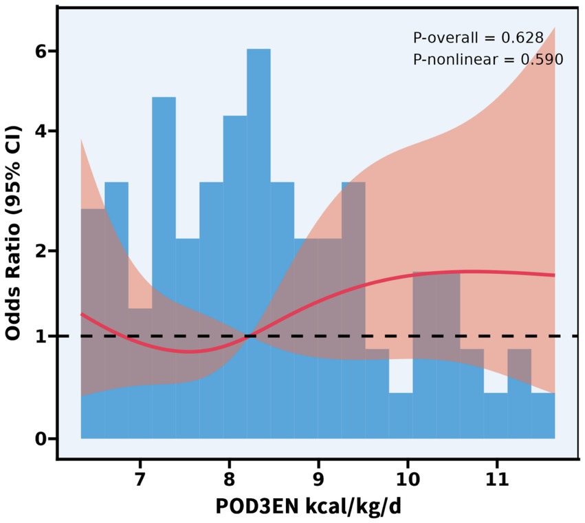 Figure 3. Association between POD3 EN kcal/kg/d and complications with the RCS function. Model with 4 knots located at 5th, 35th, 65th, and 95th percentiles. Y-axis presents the OR to present complications for any value of POD3 EN kcal/kg/d compared to individuals with reference vlaue (50th percentile) of POD3EN kcal/kg/d.