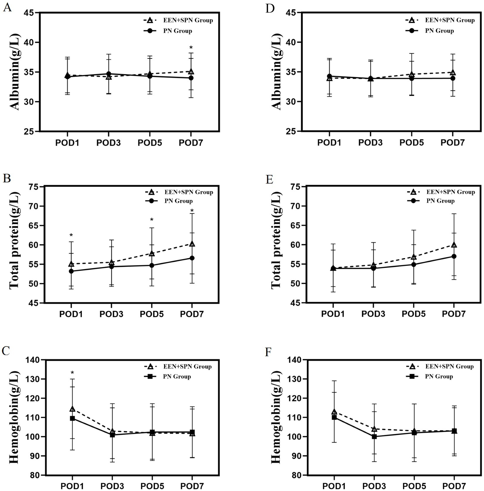 Figure 4. (A) Before PSM, mean albumin on days 1, 3, 5, 7 postoperatively; (B) before PSM, mean total protein on days 1, 3, 5, 7 postoperatively; (C) Before PSM, mean hemoglobin on days 1, 3, 5, 7 postoperatively. (D) After PSM, mean albumin on days 1, 3, 5, 7 postoperatively. (E) After PSM, mean total protein on days 1, 3, 5, 7 postoperatively. (F) After PSM, mean hemoglobin on days 1, 3, 5, 7 postoperatively. *There was significant difference between the EEN + SPN and PN group.