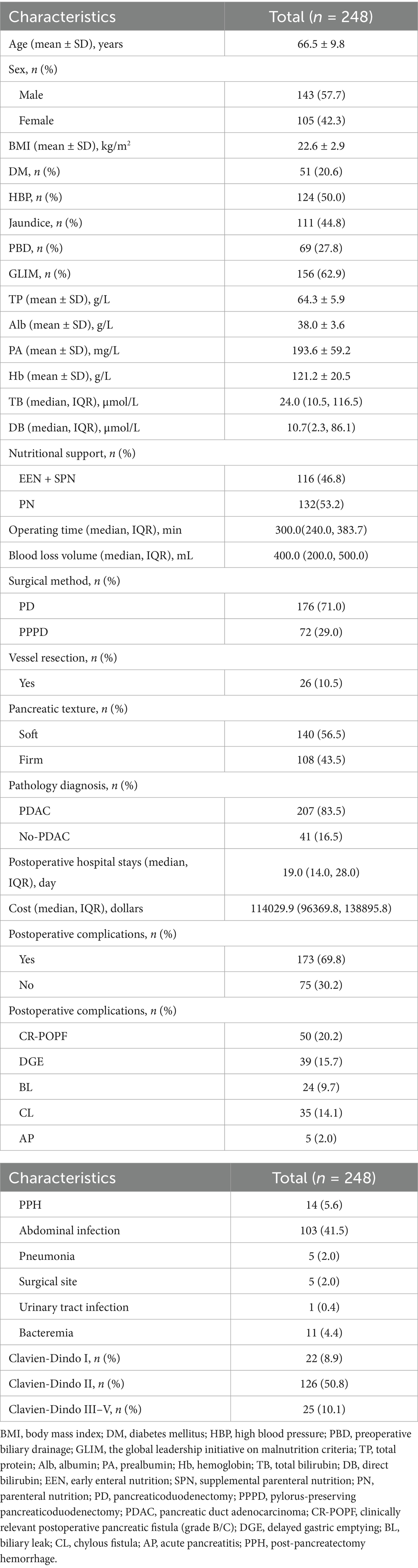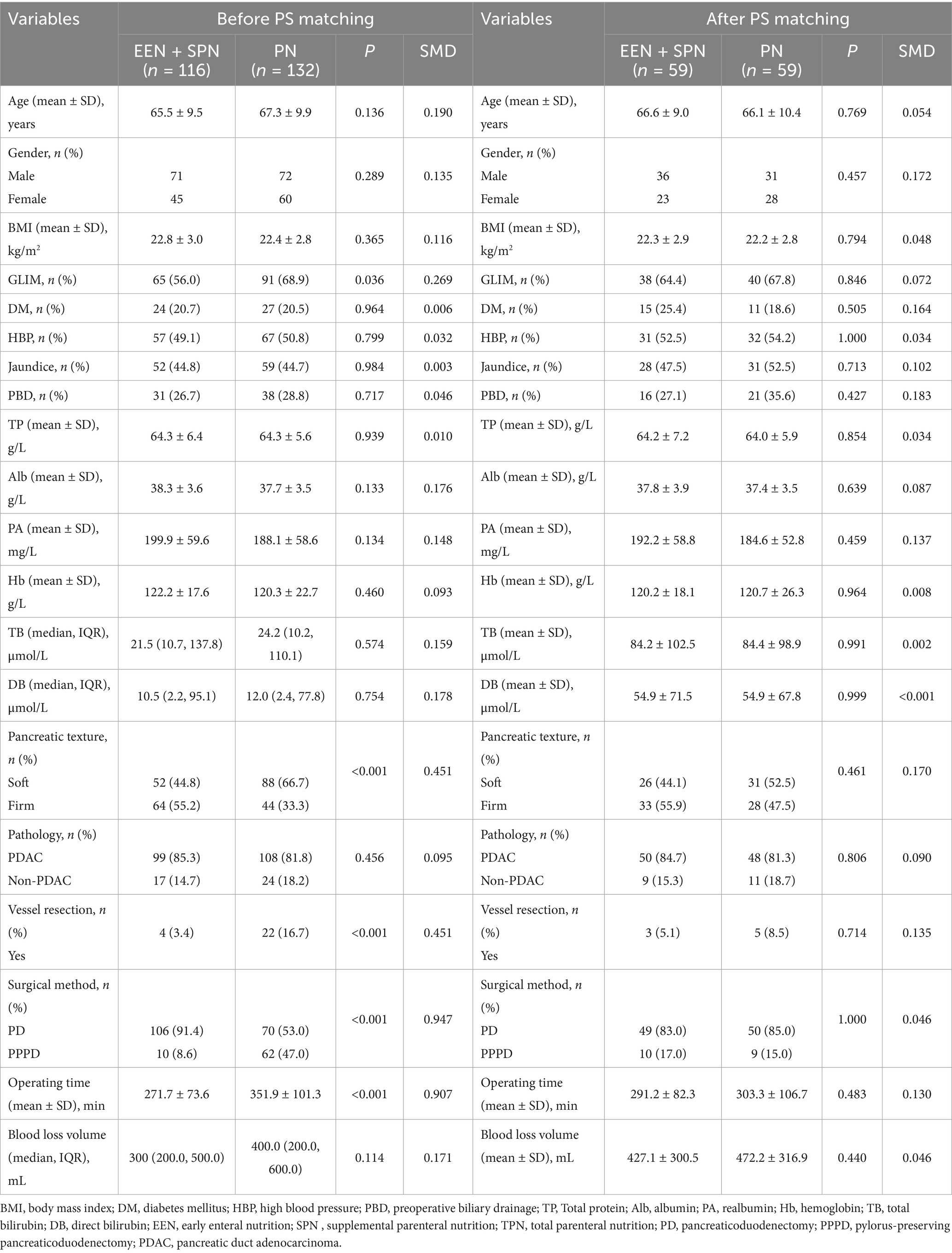 A total of 248 patients who underwent PD were initially enrolled in the study. Patients were divided into two groups based on perioperative nutritional therapy. The characteristics of all patients are shown in Table 1. There were 116 (46.8%) patients in EEN + SPN group, 132 (53.2%) in PN group. The study cohort consisted of 143 males (57.7%) and 105 females (42.3%), with an average age of 66.5 ± 9.8 years. Before surgery, the levels of total direct bilirubin (DB) and bilirubin (TB) were 10.7 (2.3, 86.1) umol/L and 24.0 (10.5, 116.5) umol/L, respectively. A total of 111 (44.8%) were diagnosed with preoperative jaundice, and 69 (27.8%) underwent preoperative biliary drainage (PBD). Postoperative complications occurred in 173 patients (69.8%). Postoperative severe complications (Clavien-Dindo grade≥III) occurred in 25 patients (10.1%), intra-abdominal infections were observed in 103 patients (41.5%), and CR-POPF developed in 50 patients (20.2%).