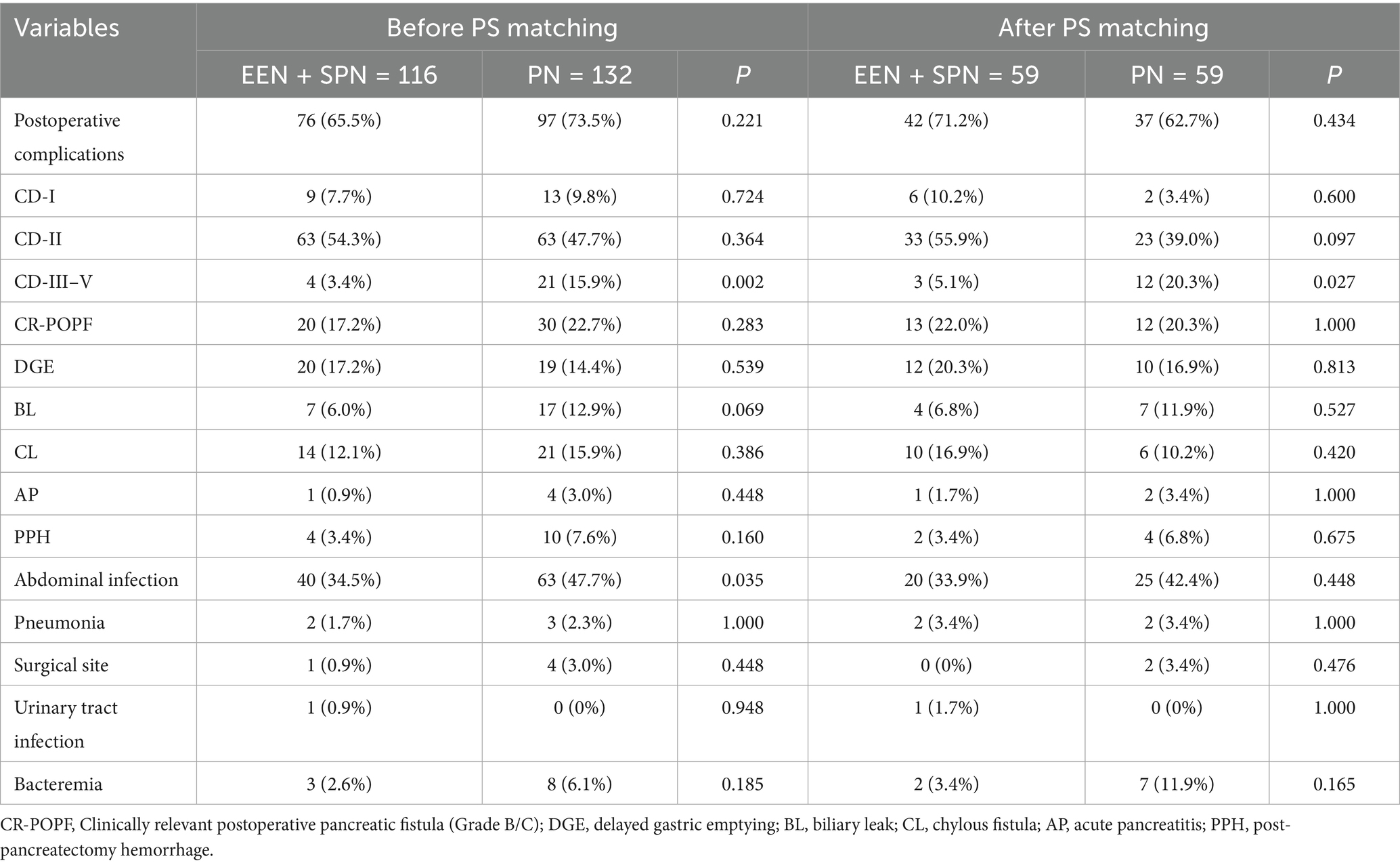 No statistically significant differences were observed in the incidence of complications between the two groups, either before or after PSM (all p > 0.05, Table 3). Before PSM, the incidence of severe postoperative complications was 3.4% in the EEN + SPN group, compared to 15.9% in the PN group (p = 0.002, Table 3). After PSM, the incidence of severe complications was 5.1% in the EEN + SPN group and 20.3% in the PN group (p = 0.027, Table 3). Both before and after PSM, the incidence of severe complications was significantly higher in the PN group. Before PSM, the incidence of intra-abdominal infection was significantly higher in the PN group (34.5% vs. 47.7%, p = 0.035). However, after PSM, the difference was no longer statistically significant (33.9% vs. 42.4%, p = 0.448). Both before and after PSM, there was no significant difference in CD-I complications between the EEN + SPN and PN groups (before PSM: 7.8% vs. 9.8%, p = 0.724; after PSM: 10.2% vs. 3.4%, p = 0.600). Similar results were observed for CD-II complications (before PSM: 54.3 vs. 47.7%, p = 0.364; after PSM: 55.9% vs.39.0%, p = 0.097) and CR-POPF (before PSM: 17.2% vs. 22.7%, p = 0.283; after PSM: 22.0% vs. 20.3%, p = 1.000). No significant differences were found in the remaining complications between the two groups (Table 3).