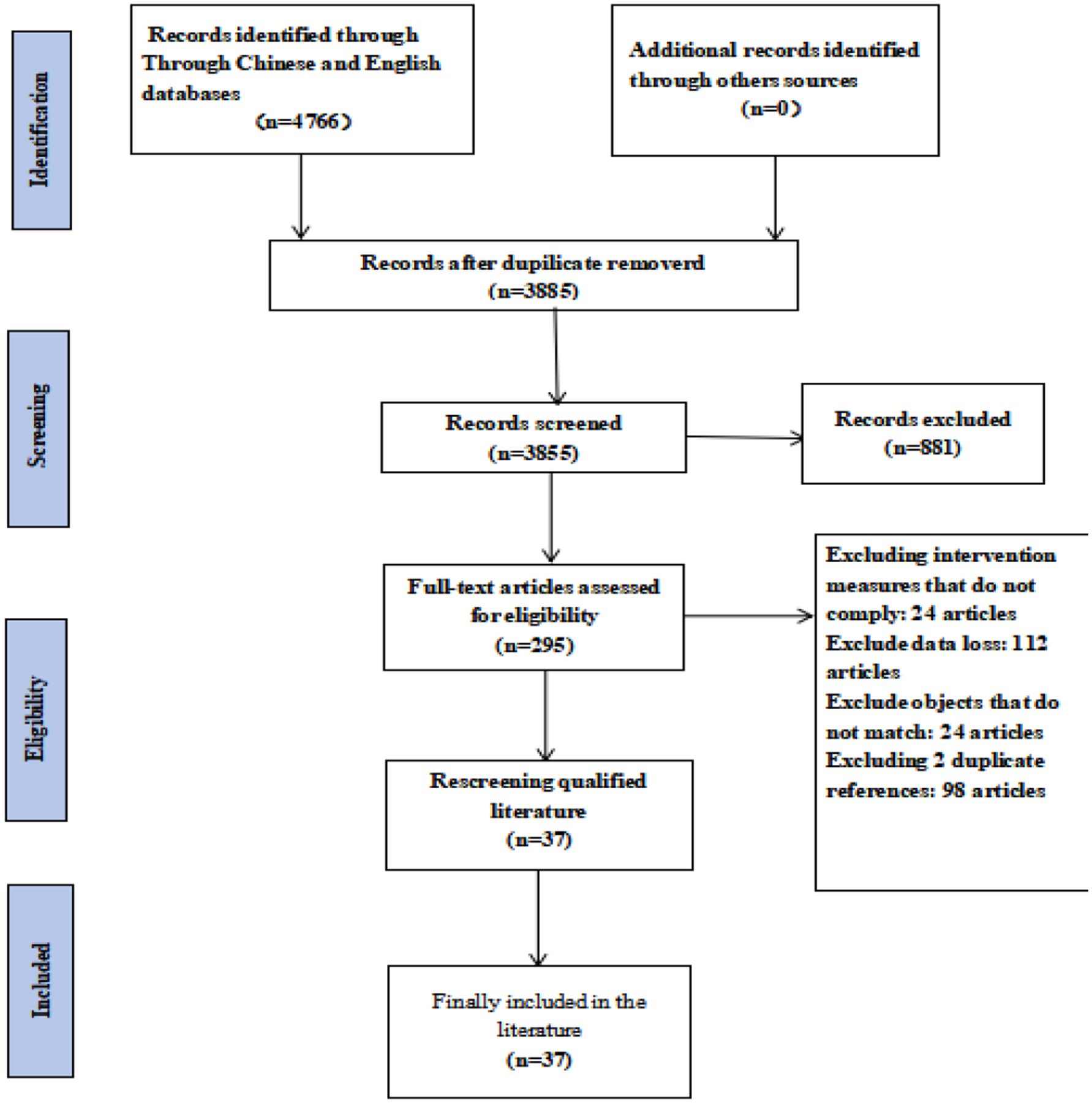 Flowchart depicting the selection process for literature review. Identification phase shows 4,766 records found in Chinese and English databases, with zero additional records from other sources. After removing duplicates, 3,885 records remain. In the Screening phase, all 3,885 records are screened, with 881 excluded. The Eligibility phase assesses 295 full-text articles, narrowing to 37 upon rescreening. Reasons for exclusion include non-compliance, data loss, mismatched objects, and duplicate references. Finally, 37 articles are included.