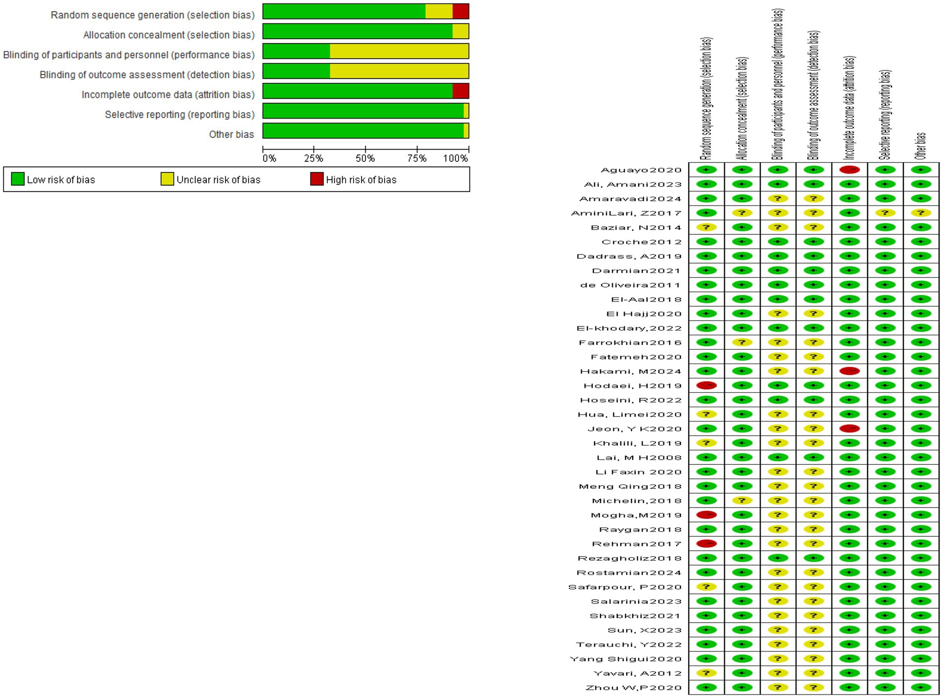 All 37 included studies reported the use of randomization. However, 31 studies did not provide detailed descriptions of the randomization method. One study used computer-generated randomization, one applied block randomization, one adopted sealed envelopes, and one used a random number generator. Among the included studies, three explicitly implemented single-blinding, nine applied double-blinding, and the remaining studies did not mention blinding procedures. Three studies presented a potential risk of incomplete outcome data. With respect to participant characteristics, 29 studies included patients with comorbidities. The reported comorbidities included coronary heart disease in two studies, hyperlipidemia in one study, and hypertension in one study. The detailed results are presented in Figure 2.