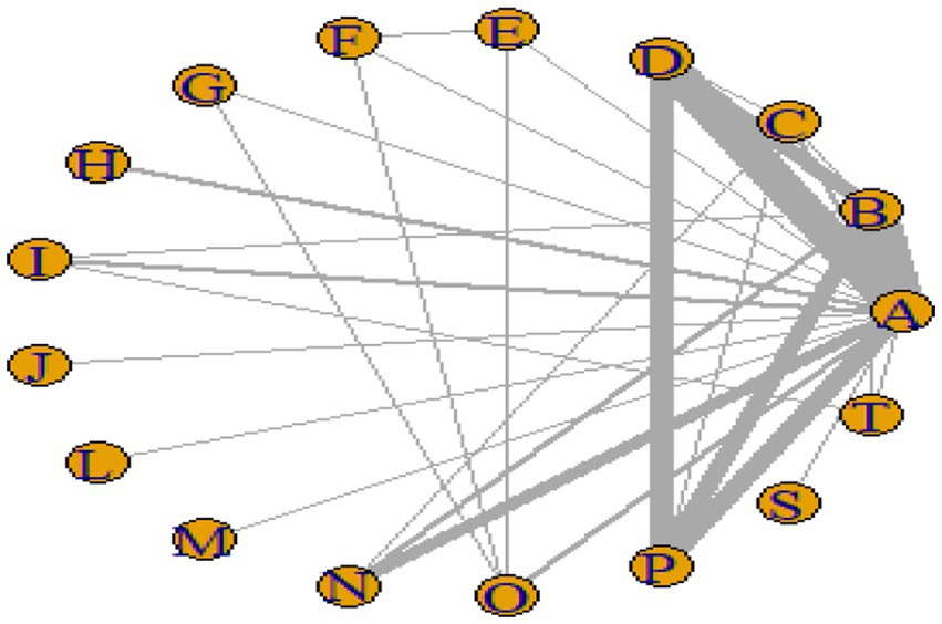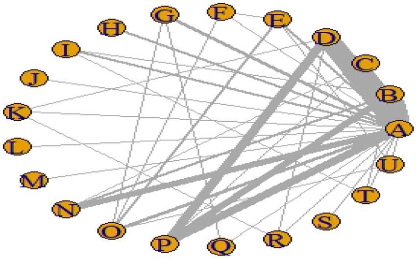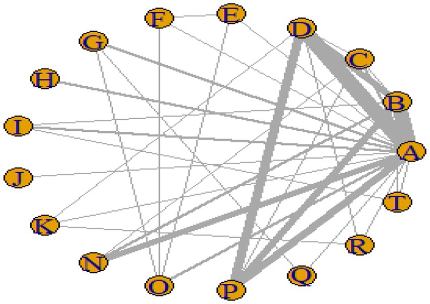Network diagram with nodes labeled A through R, connected by various lines of differing thicknesses. Thicker lines indicate stronger connections between nodes A, B, C, and D. Nodes are arranged in a circular layout.