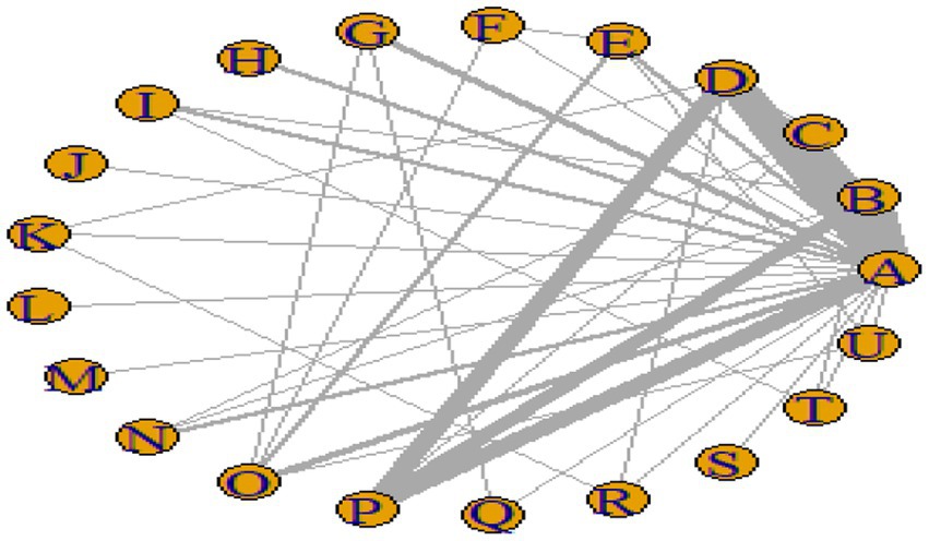 Circular graph with interconnected nodes labeled A to U. Nodes are orange with blue letters, linked by varying thickness lines. The central cluster includes nodes A through D, indicating denser connections.