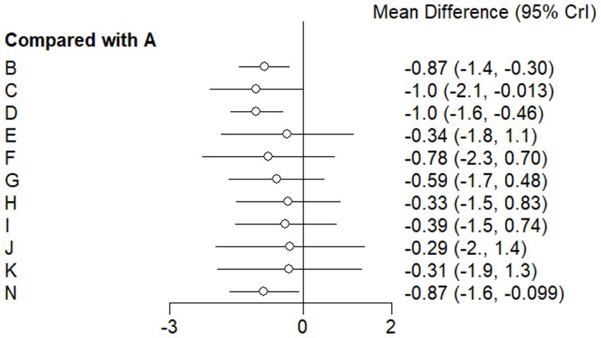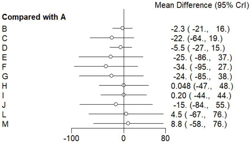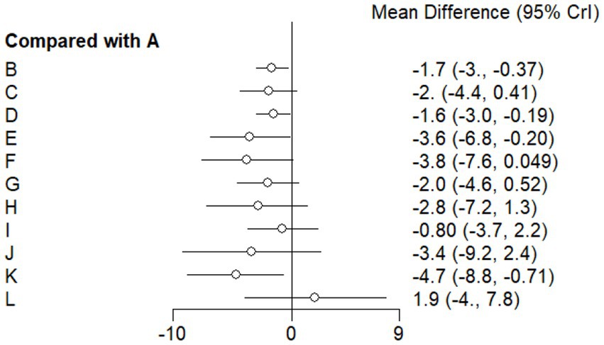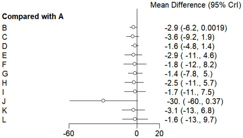 Forest plot showing mean differences in comparison to group A across groups B to L. Mean differences range from negative four point seven to one point nine, with ninety-five percent credible intervals depicted by horizontal lines for each group.