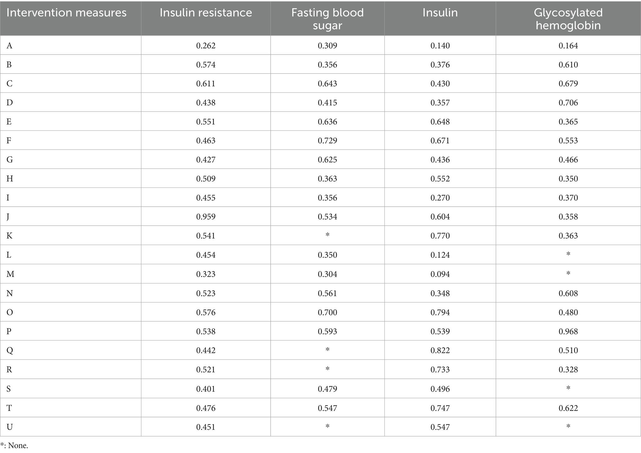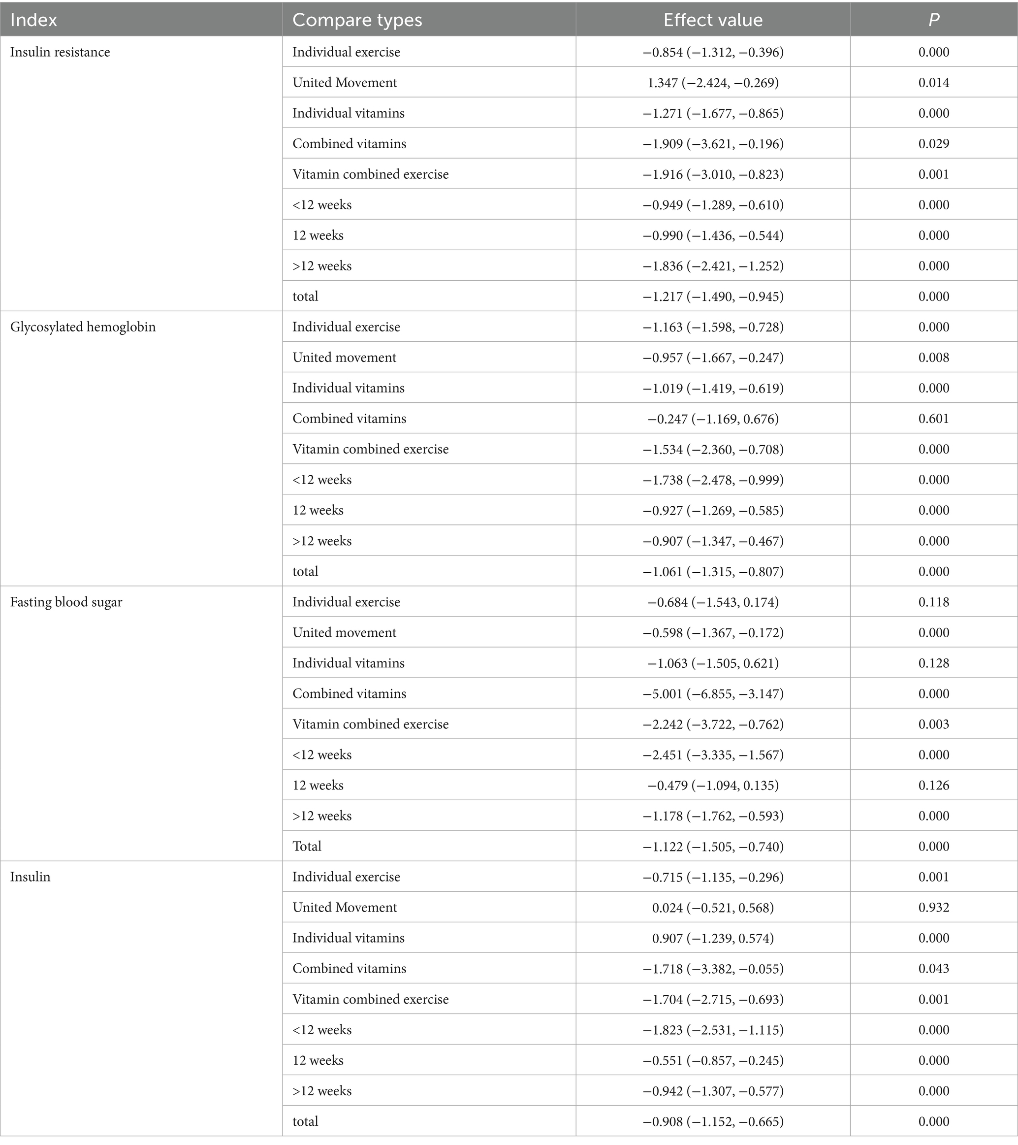 Results: Traditional meta-analyses revealed that both short-term (<12 weeks) and long-term (>12 weeks) interventions significantly improved insulin resistance and related outcomes. The exceptions included vitamin supplementation alone, which did not significantly improve glycated hemoglobin (HbA1c); neither exercise alone or vitamin supplementation alone, which failed to significantly reduce fasting blood glucose; and combined exercise interventions, which had no significant effects on insulin levels. All other interventions yielded significant benefits. Network meta-analysis revealed that, compared with the control group, probiotics provided the greatest improvement in insulin resistance. Vitamin D was most effective at improving HbA1c, whereas vitamin C had the strongest effects on fasting blood glucose and insulin indices. Dose-subgroup analysis indicated that vitamin supplementation up to 2000 IU/day most effectively reduced fasting blood glucose (p < 0.01) but had no significant effects on HbA1c or insulin (all p > 0.05). A dosage of 2,100–4,000 IU/day produced the most pronounced improvements in HbA1c (p < 0.01) and insulin (p < 0.05) but did not significantly affect insulin resistance or fasting blood glucose (all p > 0.05). Supplementation at 4100–7500 IU/day yielded the greatest improvements in insulin resistance (p < 0.01) but had no significant effect on HbA1c (p > 0.05). Exercise interventions with an intensity of ≤4 METs, performed three times per week, significantly improved insulin resistance, HbA1c, and insulin indices. Sessions lasting ≤60 min produced optimal benefits for insulin resistance and insulin measures, whereas sessions ≤45 min were most effective for HbA1c and fasting blood glucose.