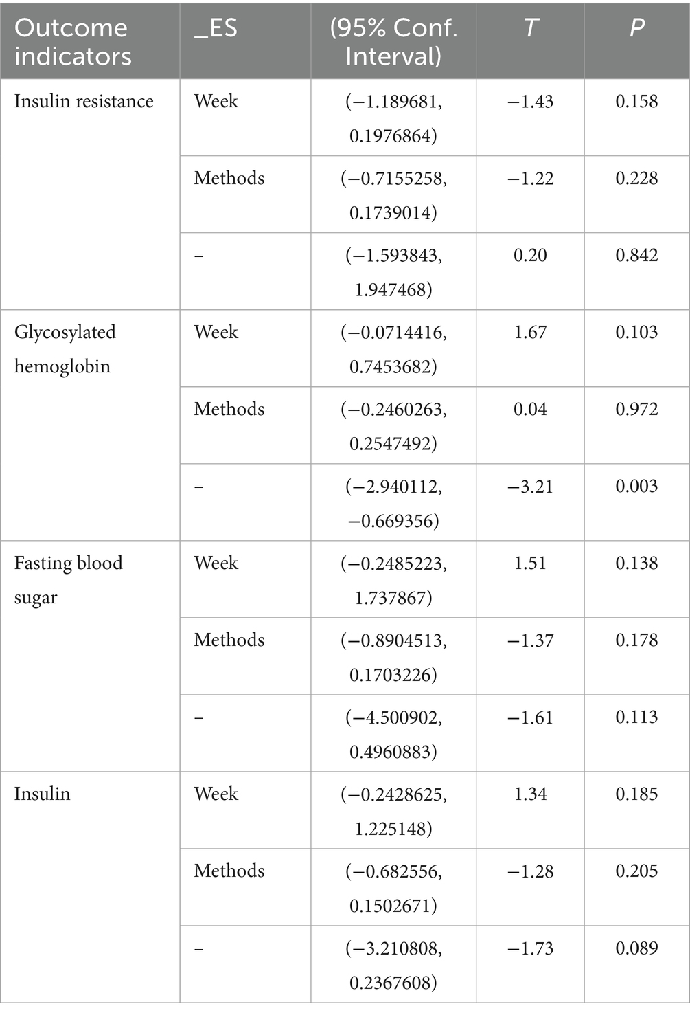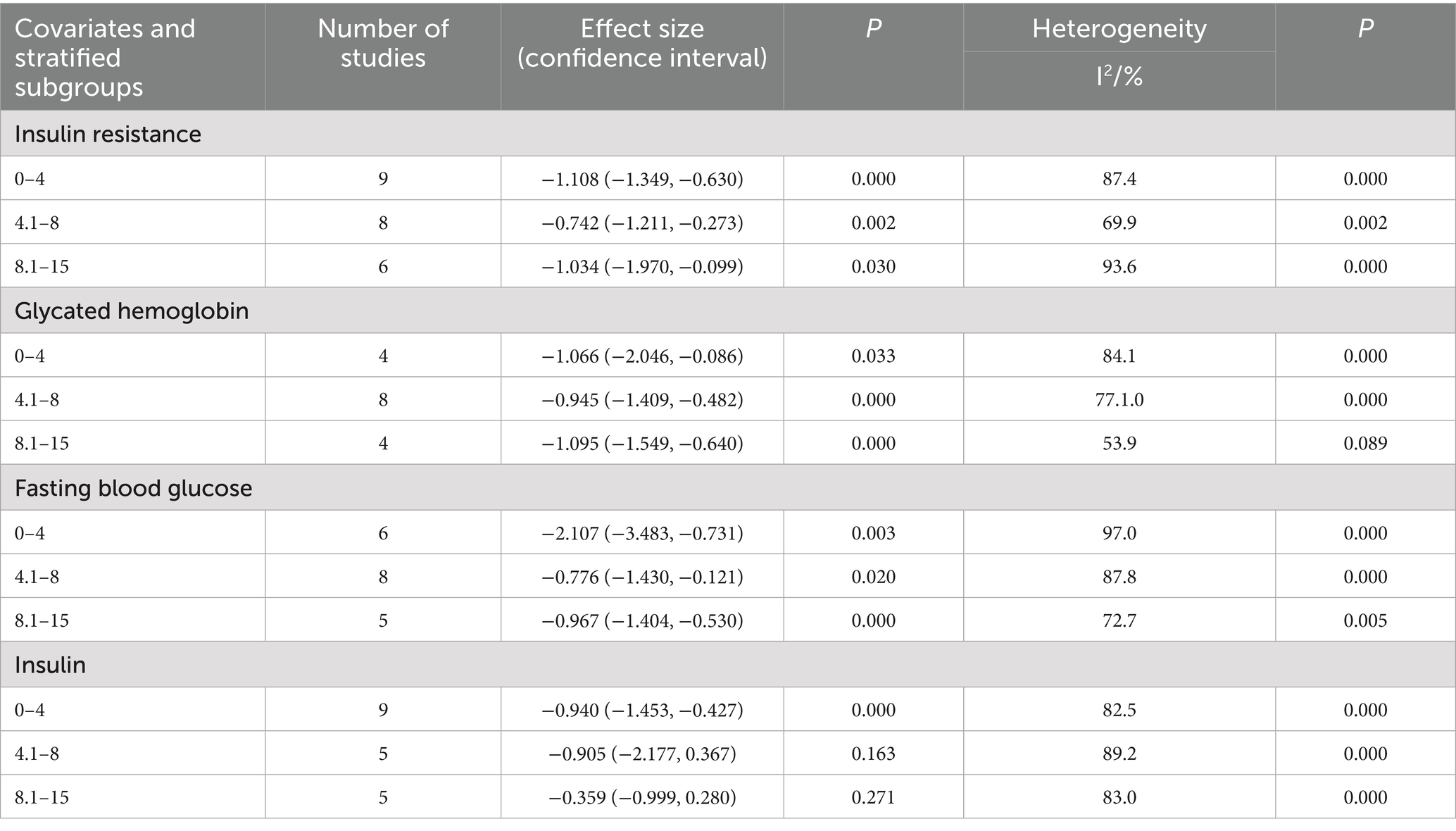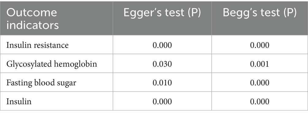 Intervention duration analysis revealed that short-term (<12 weeks), medium-term (12 weeks), and long-term (>12 weeks) interventions significantly reduced IR, insulin, and HbA1c (all p < 0.01). Interventions shorter than 12 weeks or longer than 12 weeks also significantly reduced FBS, whereas 12-week interventions did not significantly affect FBS (SMD = −0.479, 95% CI [−1.094, 0.135], p > 0.05). The detailed results are presented in Table 2.