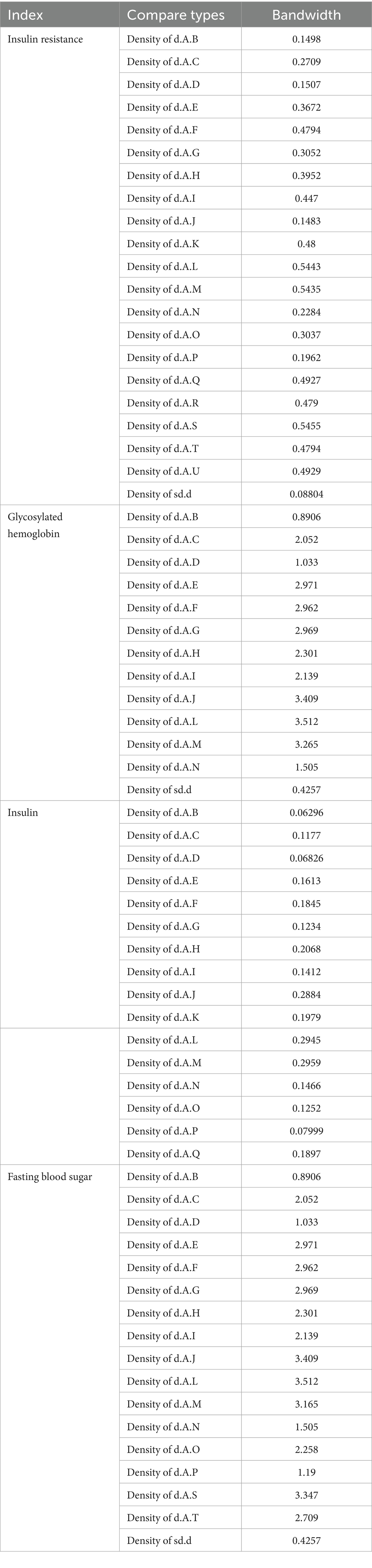 In this study, trace plots were used to assess model convergence, whereas bandwidth indicators from density plots were used to evaluate model stability. Theoretically, as the number of iterations increases sufficiently, a bandwidth approaching zero indicates progressively enhanced model stability. The results revealed that insulin resistance values ranged from 0.08804 to 0.5455, with the highest value observed for d.A.S. (0.5455). HbA1c ranged from 0.4257 to 3.512, with a d.A.L. of 3.512 as the peak value. Insulin values ranged from 0.06296 to 0.2959, peaking at d.A.M. (0.2959), and FBS ranged from 0.4257 to 3.512, also peaking at d.A.L (3.512). Most sd.d values were low, whereas d.A.L represented a core high value across indicators. Overall, HbA1c and FBS exhibited greater density and more complete information (see Table 6).