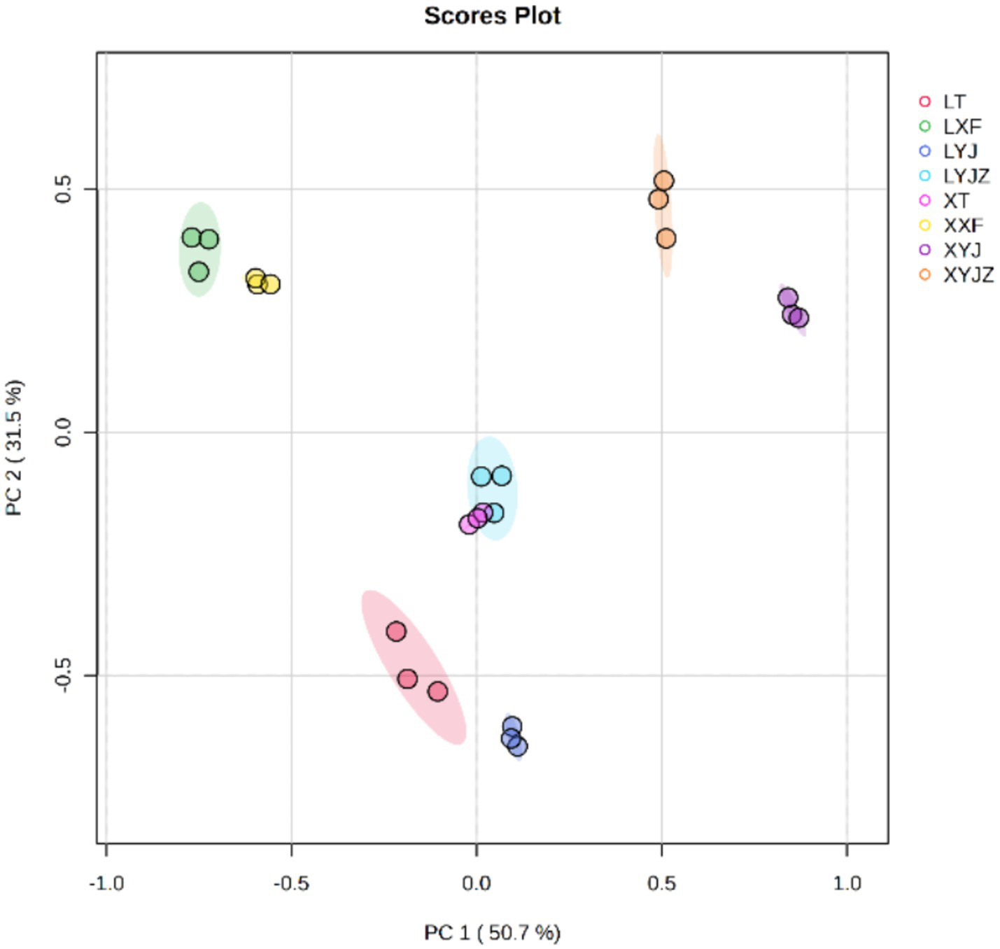 The electronic tongue, which simulates human gustatory perception, was used to analyze the taste characteristics of the samples. This technique is fast and convenient and can serve as a substitute or supplement to traditional sensory evaluation. PCA was conducted on the data obtained by the electronic tongue. As shown in Figure 1, The contribution rates of the first and second principal components (PC1 and PC2) were 50.7 and 31.5%, respectively, with a cumulative contribution rate of 82.2%. This indicates significant differences among the sample groups, with no overlap between them, demonstrating that the electronic tongue technology can effectively distinguish among the different samples.