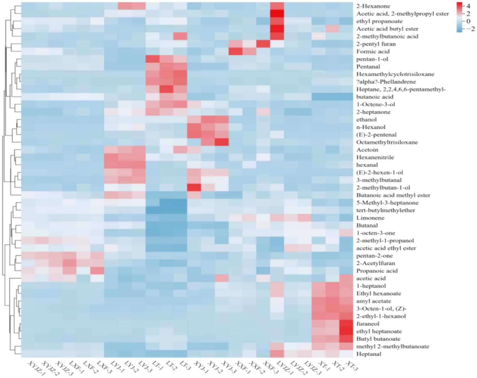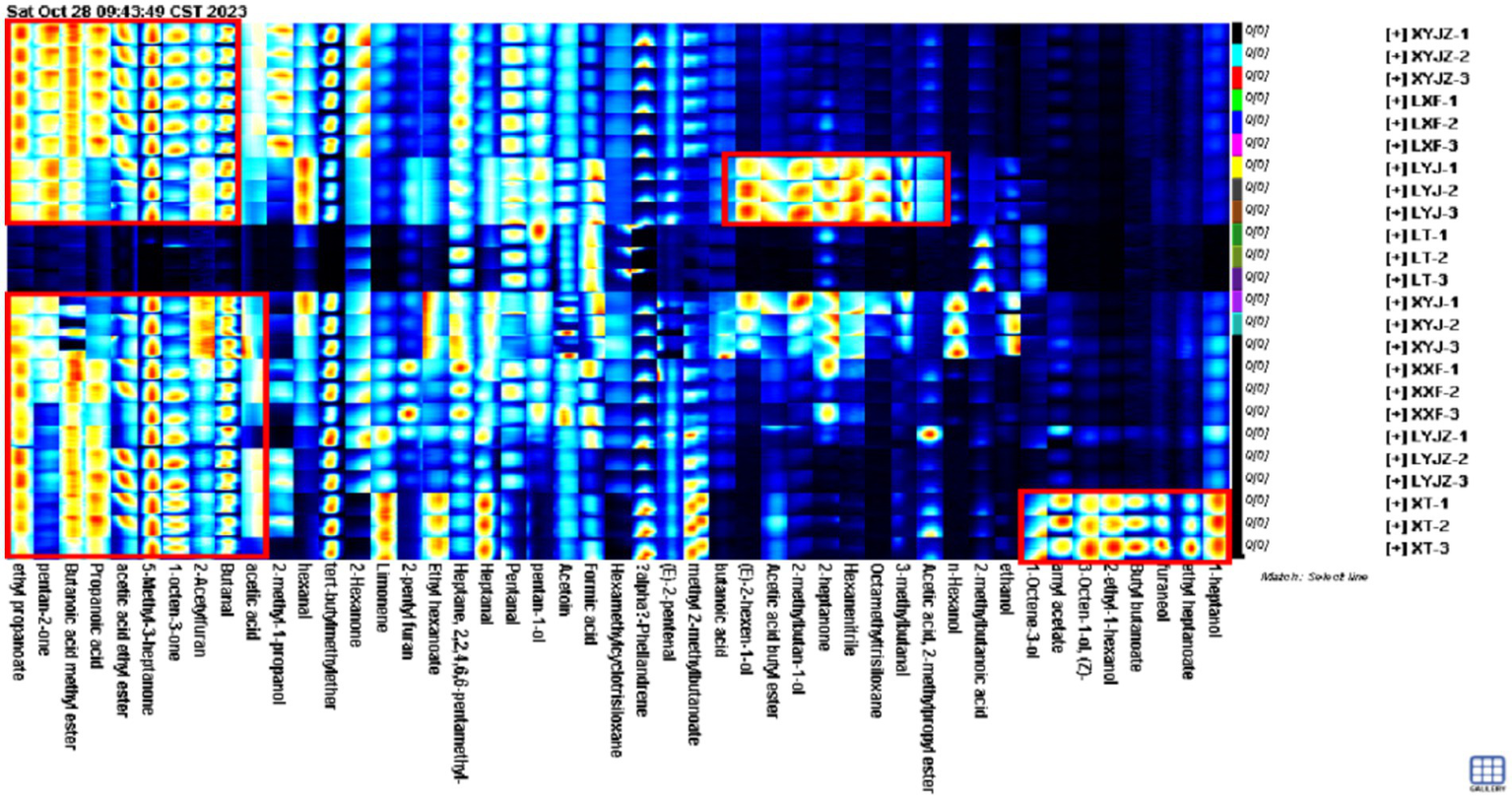 Topographic plots and gallery plots were generated using the instrument software LAV, Reporter, and Gallery Plot. Qualitative analysis of volatile compounds was performed based on the GC × IMS Library Search using the integrated NIST and IMS databases. The relative contents of volatile compounds were calculated based on normalized peak volumes.