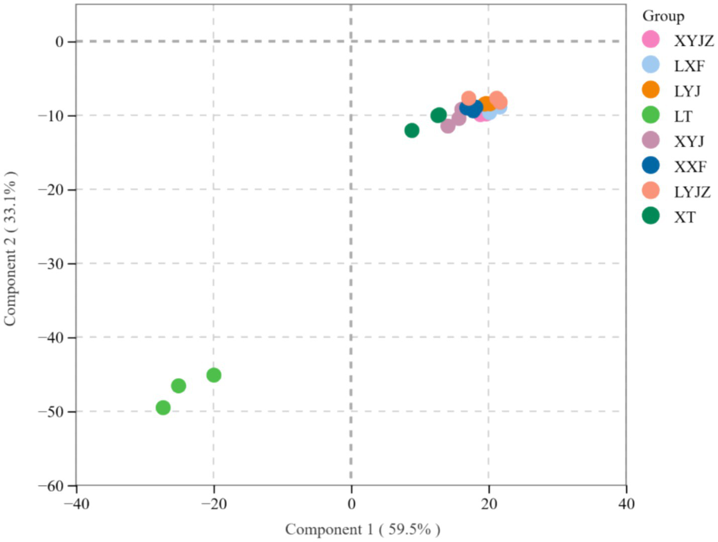PCA is a classical dimensionality reduction and pattern recognition method, particularly suitable for visualizing high-dimensional, multivariate flavor data and conducting preliminary clustering analysis. PCA intuitively displays differences and distribution trends among samples, laying the foundation for subsequent discriminant analysis and flavor compound screening (26). In contrast, other methods such as hierarchical cluster analysis (HCA) or discriminant analysis (DA) are typically employed for later-stage classification or supervised learning. Therefore, PCA is widely used in flavor profile identification (27).