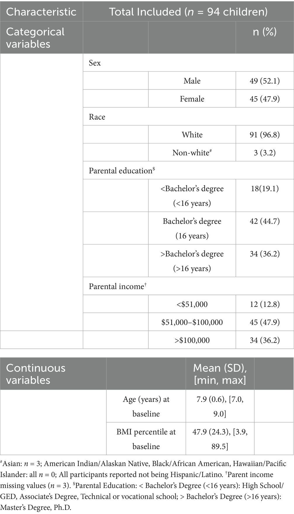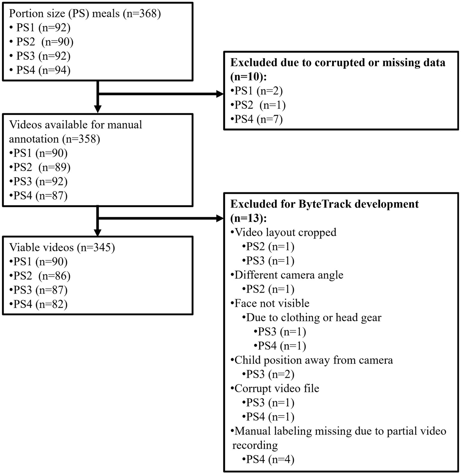 ByteTrack was trained on 242 videos (4,770 min) of laboratory meals in 94 children aged 7–9 years. Children consumed 4 laboratory meals with approximately 1-week between each meal. Video data came from the Food and Brain study (ClinicalTrials.gov, NCT03341247), a prospective investigation examining neural and cognitive risk factors for the development of obesity in middle childhood. The study employed a longitudinal family risk design, with children attending six baseline visits and one follow-up visit conducted 1 year after the first baseline visit. Data related to neurocognitive and longitudinal outcomes are reported elsewhere (25–31). Methods used to collect anthropometric and demographic data can be found in earlier studies (26, 27, 32). Families were recruited for the study based on maternal weight status: low (maternal BMI < 25) versus high (maternal BMI ≥ 30) risk for obesity. All children were below the 90th BMI-for-age percentile at baseline. The study received approval from the Pennsylvania State University Institutional Review Board. Parental consent and child assent were obtained at the first visit, and families received modest monetary compensation for completing each study visit. The final sample included 94 subjects who had a total of 345 viable meal videos (Figure 1 for reference to viability of data). Participant inclusion and exclusion with relevant CONSORT diagram are detailed in earlier publications (25). Demographic data for the sample can be found in Table 1. Supplementary Table 1 provides detailed information on subject-by-subject meal videos considered for training and testing, including subject IDs and meal sessions, along with details on exclusions and inclusions.