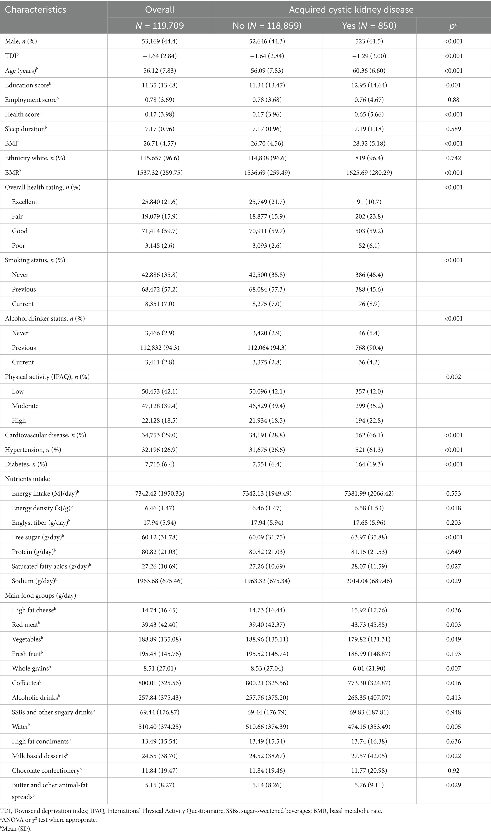 Acquired renal cysts (ARC) are a prevalent renal condition, primarily characterized by benign cystic structures (1). Detection has markedly increased in routine physical examinations. Several cohort studies suggest that renal cysts may impair renal function and increase the risk of nephron loss (2–4). Additionally, ARC is associated with a higher risk of metabolic syndrome, particularly hypertension, which is an independent risk factor (3, 5, 6). Despite the high prevalence of ARC, research on its etiology and management is limited, with minimal attention given to potential dietary influences (7–9). Both healthy individuals and patients with ARC express a strong desire for dietary guidance (10).