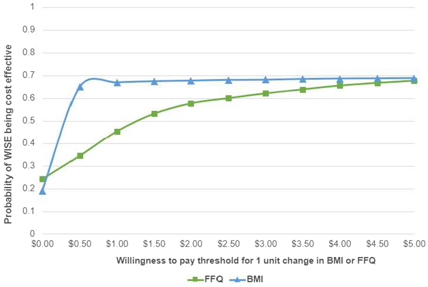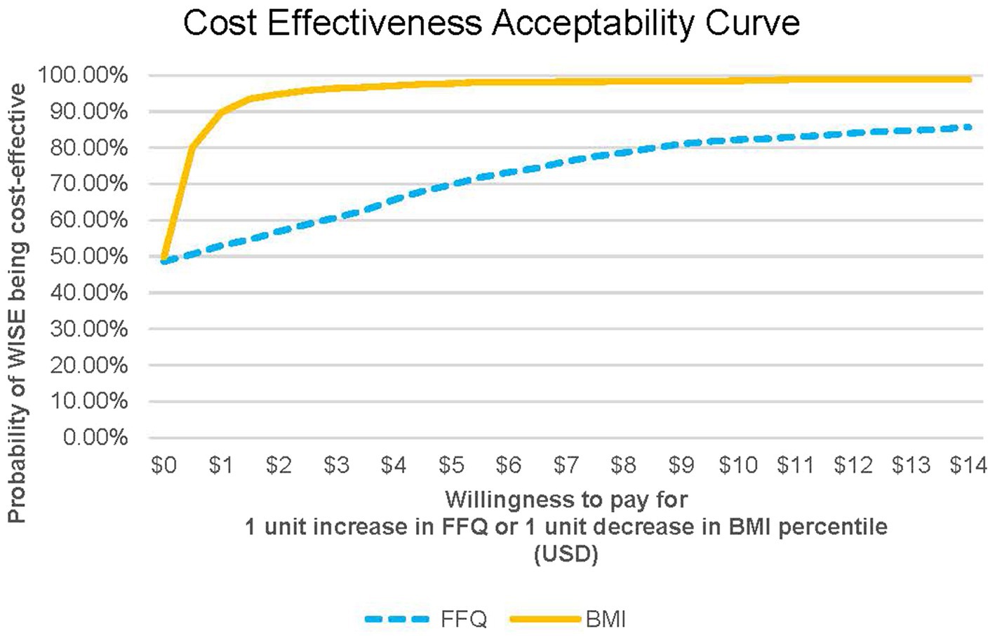 Figure 2. Cost effectiveness acceptability curve for FFQ and BMI. FFQ, food frequency questionnaire outcome; BMI, BMI relative to 95th percentile outcome.