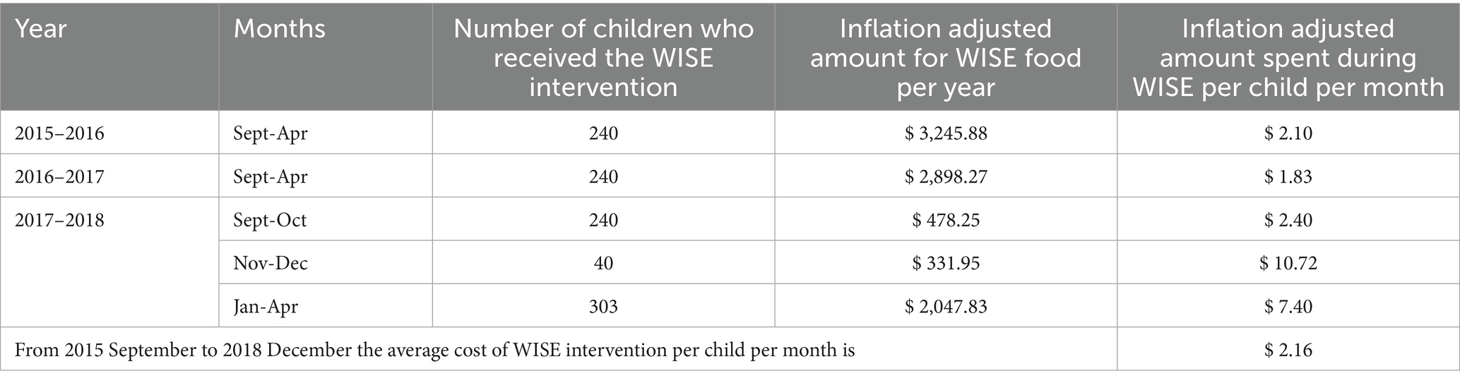 On average, the FFQ score increased by 0.29 units among children at WISE sites (t-value = 7.06; p < 0.01), while children at UNE sites experienced only a 0.05-unit increase (t-value = 1.43; p = 0.15). No significant differences in BMI were found between WISE and UNE sites. Table 1 presents the monthly and annual per-child costs of implementing WISE. The average monthly cost of the WISE intervention per child was $2.16. This amount represents approximately 60% of the $3.52 CACFP reimbursement received by the sites.