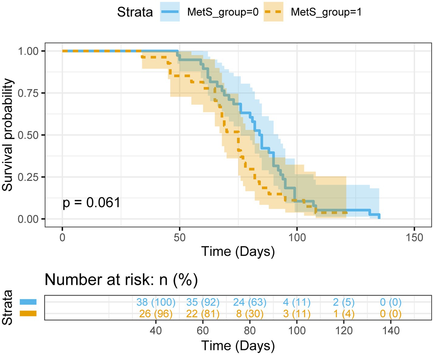 All enrolled patients experienced disease progression or death (PFS event rate 100%). The non-MetS group exhibited a median PFS of 84.5 days (95% CI: 76–92), compared to 75.0 days (95% CI: 68–82) in MetS patients, representing a clinically relevant 9.5-day survival disadvantage for MetS patients. Kaplan–Meier analysis (Figure 5) demonstrated progressive separation of survival curves, with log-rank testing non-significant trend (χ2 = 3.52, p = 0.061). This 12.7% reduction in median PFS suggests accelerated disease progression in MetS patients despite standardized chemotherapy and nutritional intervention.