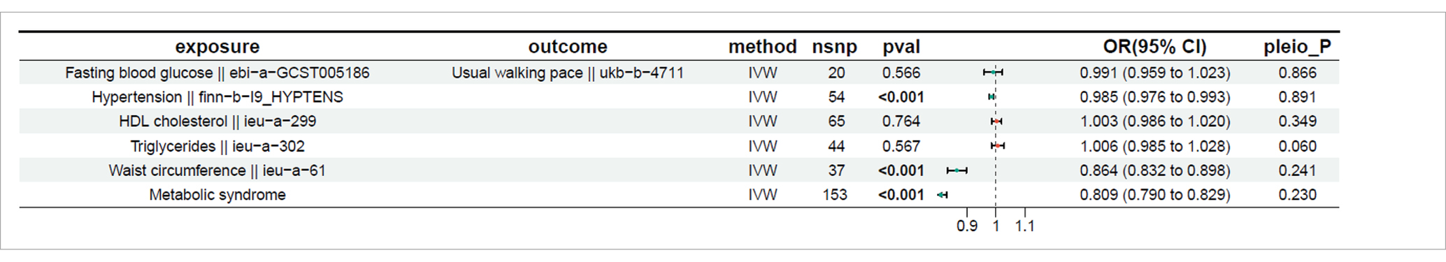 In the analysis of sarcopenia-related outcomes, MR analysis revealed that individual components of MetS were significantly negatively associated with walking speed. These findings indicate that genetic predisposition to higher waist circumference and hypertension may lead to a decrease in walking speed, thereby identifying them as potential causal risk factors for impaired physical function.