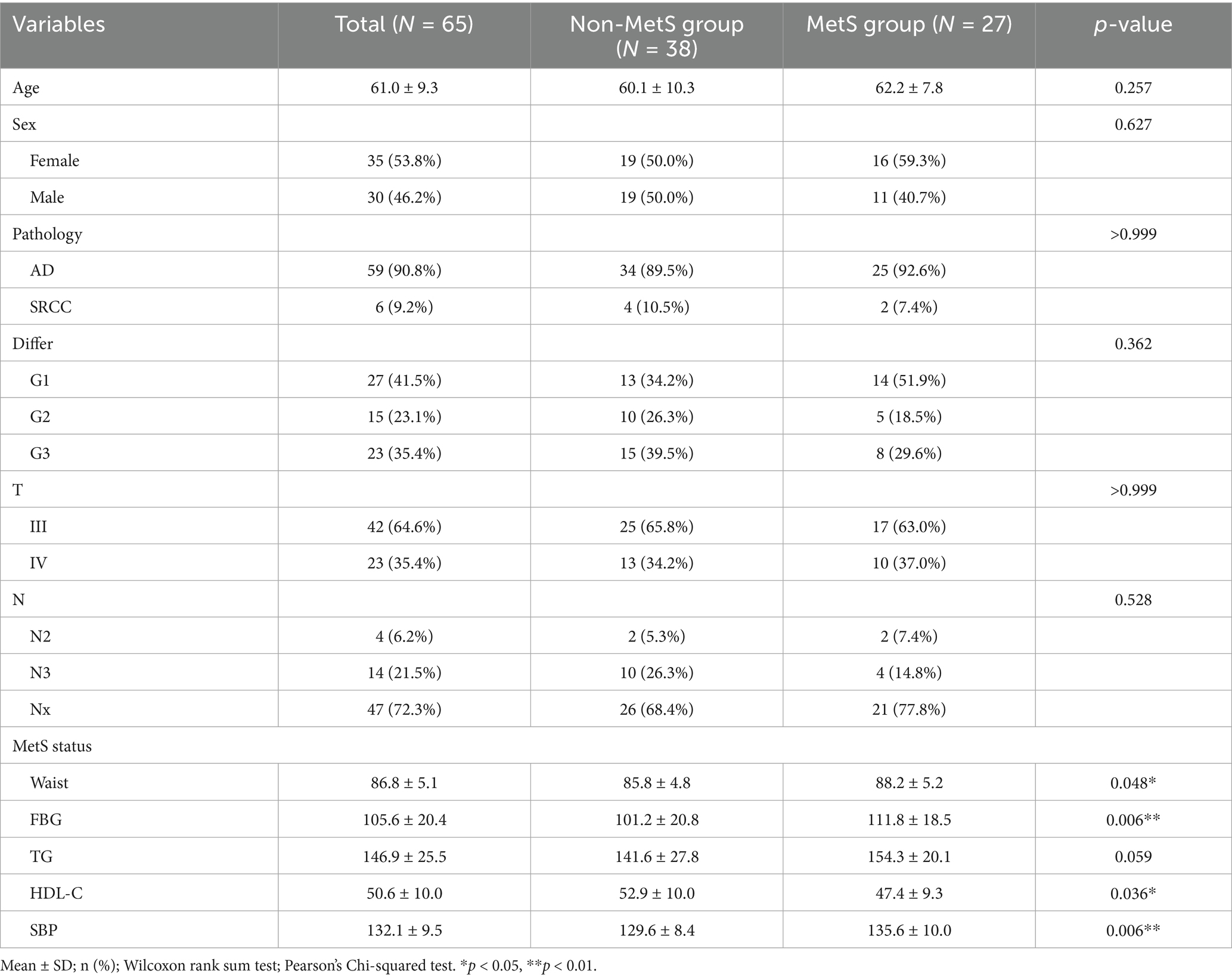 The study included 65 patients with metastatic gastric cancer (TNM stage IV, M1) and sarcopenia, stratified by MetS status (MetS: n = 27; non-MetS: n = 38) according to IDF/AHA criteria (Table 3). Baseline characteristics showed no significant differences in age (60.1 ± 10.3 vs. 62.2 ± 7.8 years, p = 0.257), sex distribution (50.0% vs. 59.3% female, p = 0.627), or tumor differentiation (34.2% vs. 51.9% G1, p = 0.362). MetS patients had significantly higher waist circumference (88.2 ± 5.2 vs. 85.8 ± 4.8 cm, p = 0.048), fasting glucose (111.8 ± 18.5 vs. 101.2 ± 20.8 mg/dL, p = 0.006), systolic blood pressure (135.6 ± 10.0 vs. 129.6 ± 8.4 mmHg, p = 0.006), and lower HDL-C (47.4 ± 9.3 vs. 52.9 ± 10.0 mg/dL, p = 0.036), with borderline elevated triglycerides (154.3 ± 20.1 vs. 141.6 ± 27.8 mg/dL, p = 0.059). All patients had metastatic disease (T3:64.6%, T4:35.4%; N2:6.2%, N3:21.5%), with comparable T-stage (65.8% vs. 63.0% T3, p > 0.999) and N-stage (26.3% vs. 14.8% N3, p = 0.528) between groups. Histopathology showed predominantly adenocarcinoma (90.8%), with signet ring cell carcinoma equally distributed (9.2%, p > 0.999).