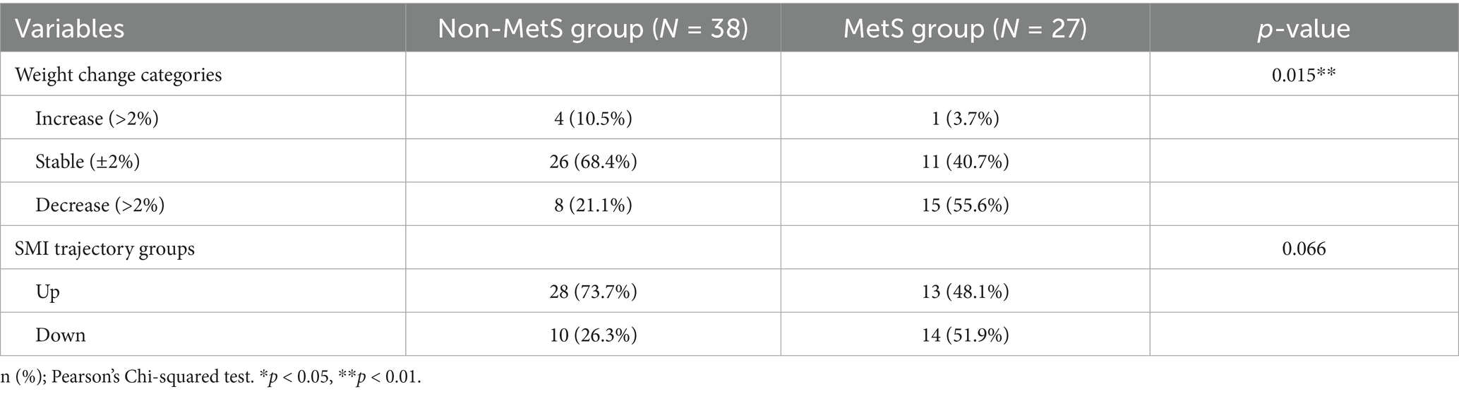 The baseline clinical characteristics and distribution of post-treatment parameters across study groups are detailed in Supplementary Table 3. Therapeutic efficacy analysis revealed significant MetS-dependent divergence in body composition and nutritional biomarkers (Figure 4; Table 4). Linear mixed models demonstrated universal weight reduction across all patients (time effect: F = 28.4, p < 0.001), with MetS patients exhibiting 2.6-fold greater weight loss (−1.70 kg vs. − 0.66 kg; MetS×time interaction F = 7.03, p = 0.01). Skeletal muscle responses showed differential preservation patterns: non-MetS patients gained 0.91 cm2/m2 in SMI (p = 0.004) versus MetS stagnation (Δ = +0.02 cm2/m2, p = 0.967), with borderline time-by-MetS interaction (F = 3.63, p = 0.061). Categorical analysis confirmed disproportionate deterioration in MetS group (85% weight loss vs. 42% non-MetS; χ2 = 8.39, p = 0.015), paralleled by divergent SMI trajectories (73.8% non-MetS improvement vs. 48.1% MetS; χ2 = 3.39, p = 0.066).
